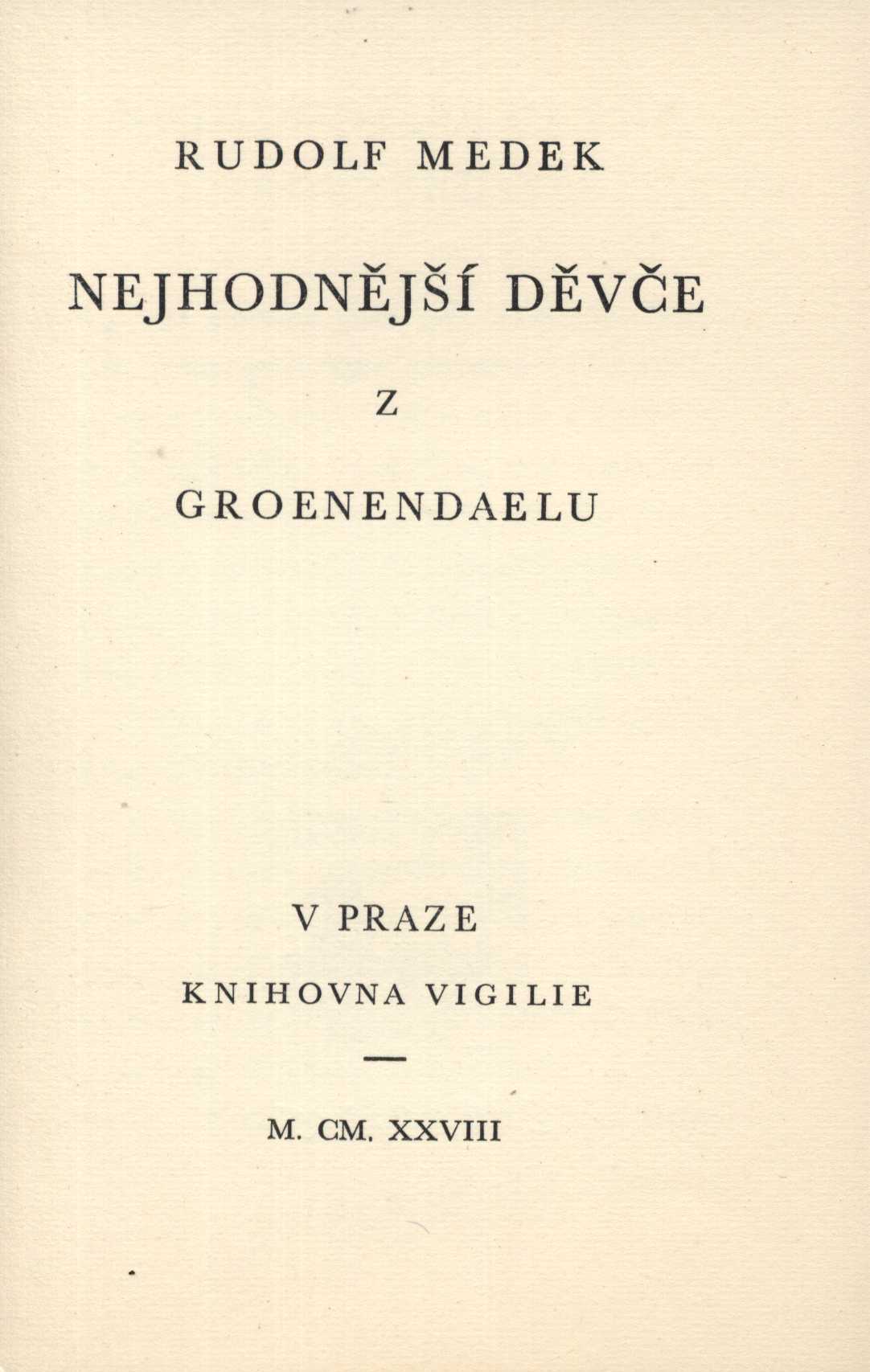 Title information Nejhodnější děvče z Groenendaelu / Rudolf Medek ; [obálka i úprava Cyrila Boudy] Personal name Medek, Rudolf, 1890-1940 (Author) Další autoři Jež, Štěpán, 1885-1970 (Publisher) Bouda, Cyril, 1901-1984 (Book designer) (Bookjacket designer) Corporation Burda (knihtiskárna) (Printer) Publication V Praze : Štěpán Jež, 1928 Manufacture (Vlad. Burda) Scope 52 s. ; 8° ISBN brož. Edition Vigilie : bibliofilská knihovna sv. 3