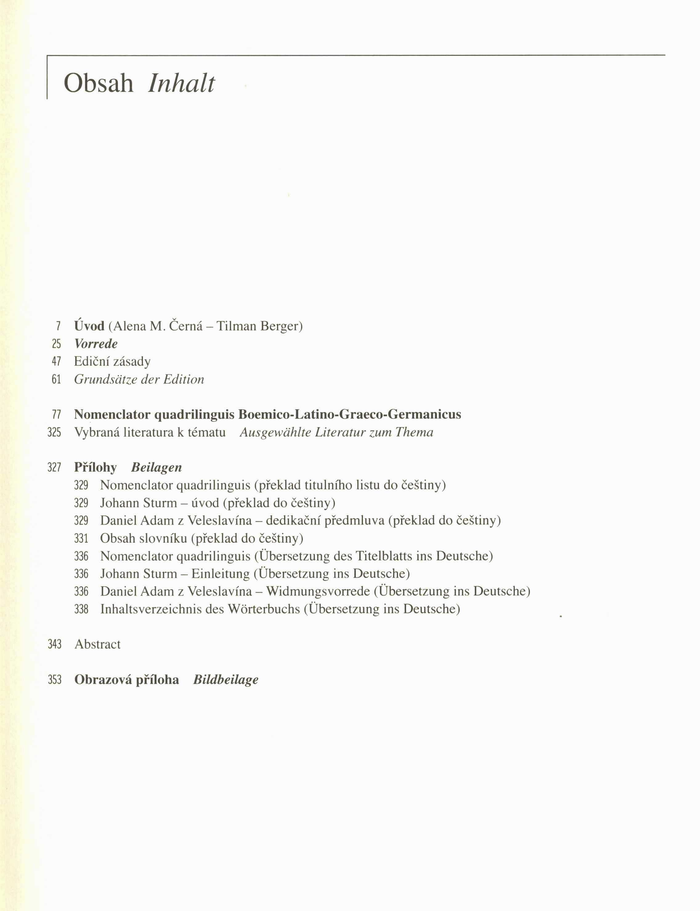 Nomenclator quadrilinguis Boemico-Latino-Graeco-Germanicus / Daniel Adam z Veleslavína ; ze starého tisku k vydání připravili Alena M. Černá, Tilman Berger, Alena Hadravová a Kateřina Pořízková za technické spolupráce Borise Lehečky ; sazba Jakub Krč, studio Lacerta. -- Vydání 1. -- Praha : Academia, 2015. -- Český Těšín : Těšínská tiskárna, a. s. -- 365 stran: ilustrace, portréty, faksimile + 1 CD ; 27 cm. -- Částečně přeloženo z latiny do češtiny a němčiny. - Český, latinský, řecký a německý text. - Obálka zdobená portrétem a s dvoubarevným textem. - Bílá vazba zdobená portrétem. - Na přední záložce německá biografie, na zadní záložce anglická biografie a bibliografie Adama z Veleslavína. - Nakladatelská značka na vakátě. - Frontispis. - Obsah. - Úvod a ediční zásady v češtině a němčině. - Bibliografické odkazy. - Vybraná literatura. - Přílohy (kapitoly v češtině a němčině). - Anglické resumé. - Obrazová příloha (faksimile, černobílé portréty, fotografie). - Na zadním přídeští vlepena páska s vloženým CD. - Text na zadní straně obálky. - Přebal. -- ISBN : 978-80-200-2406-0 (vázáno). Černá, Alena M., 1964-. Berger, Tilman, 1956-. Hadravová, Alena, 1956-. Pořízková, Kateřina, 1976-. Lehečka, Boris, 1971-. Krč, Jakub, 1973-