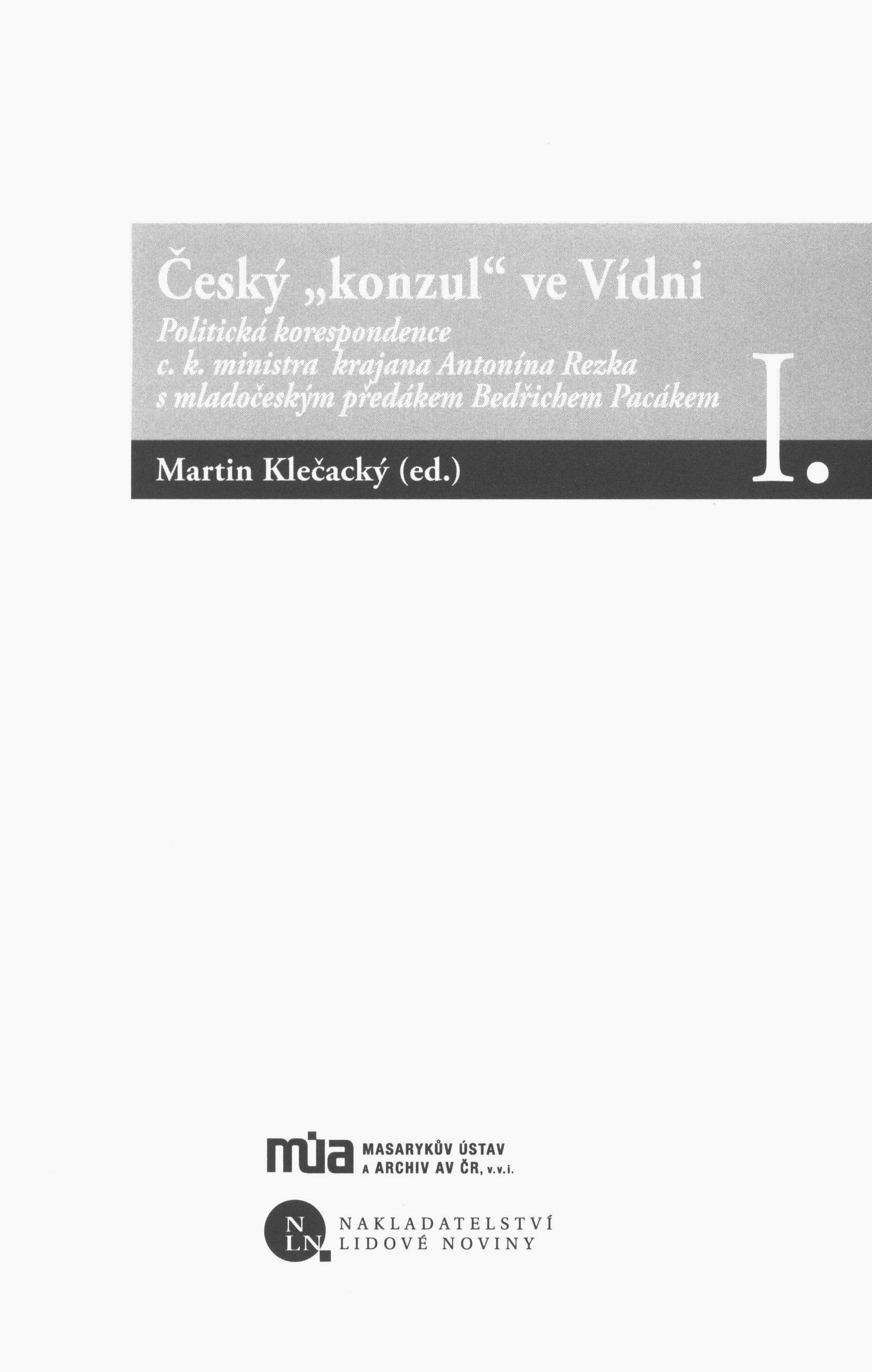 Title information Český "konzul" ve Vídni : politická korespondence c.k. ministra krajana Antonína Rezka s mladočeským předákem Bedřichem Pacákem, 1 / Martin Klečacký (ed.) ; [obálku navrhla Milada Hartlová] Personal name Rezek, Antonín, 1853-1909 (Correspondent) (Recipient) Další autoři Pacák, Bedřich, 1846-1914 (Correspondent) (Recipient) Klečacký, Martin, 1985- (Editor) Hartlová, Milada, 1967- (Bookjacket designer) Corporation Lidové noviny (nakladatelství) (Publisher) Masarykův ústav a Archiv Akademie věd ČR (Publisher) Akcent tiskárna Vimperk (Printer) Edition statement Vyd. 1. Publication Praha : NLN, Nakladatelství Lidové noviny : Masarykův ústav a Archiv AV ČR, 2015 Manufacture Akcent) Scope 378 s. : il., portréty, faksim. ISBN 978-80-7422-423-2 (váz.) Edition Ego, sv. 6