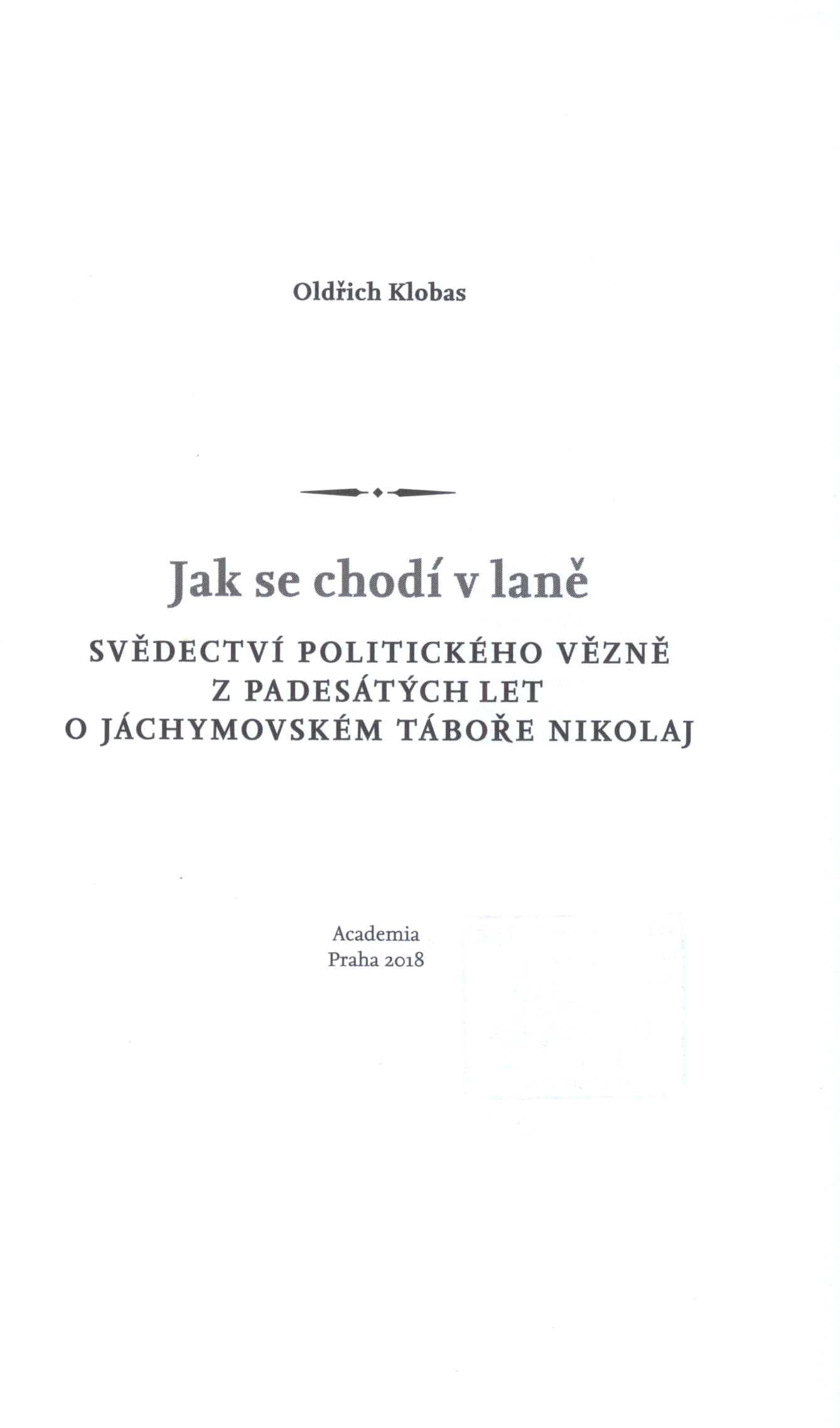 Title information Jak se chodí v laně : svědectví politického vězně z padesátých let o jáchymovském táboře Nikolaj / Oldřich Klobas ; předmluva Antonín Bína ; grafická úprava a obálka Pergamen Trnava, s. r o. Personal name Klobas, Oldřich, 1933-2005 (Author) Další autoři Bína, Antonín, 1957- (Author of introduction) Corporation Pergamen Trnava, s. r.o. (grafické studio, studio vizuální komunikace) (Book designer) (Bookjacket designer) Academia (nakladatelství) (Publisher) Serifa (tiskárna) (Printer) Edition statement Vydání 3., v nakladatelství Academia 1. Publication Praha : Academia, 2018 Manufacture Praha : SERIFA, s.r.o. Scope 258 stran ; 21 cm ISBN 978-80-200-2895-2 (vázáno) Edition Edice Paměť ; svazek 102