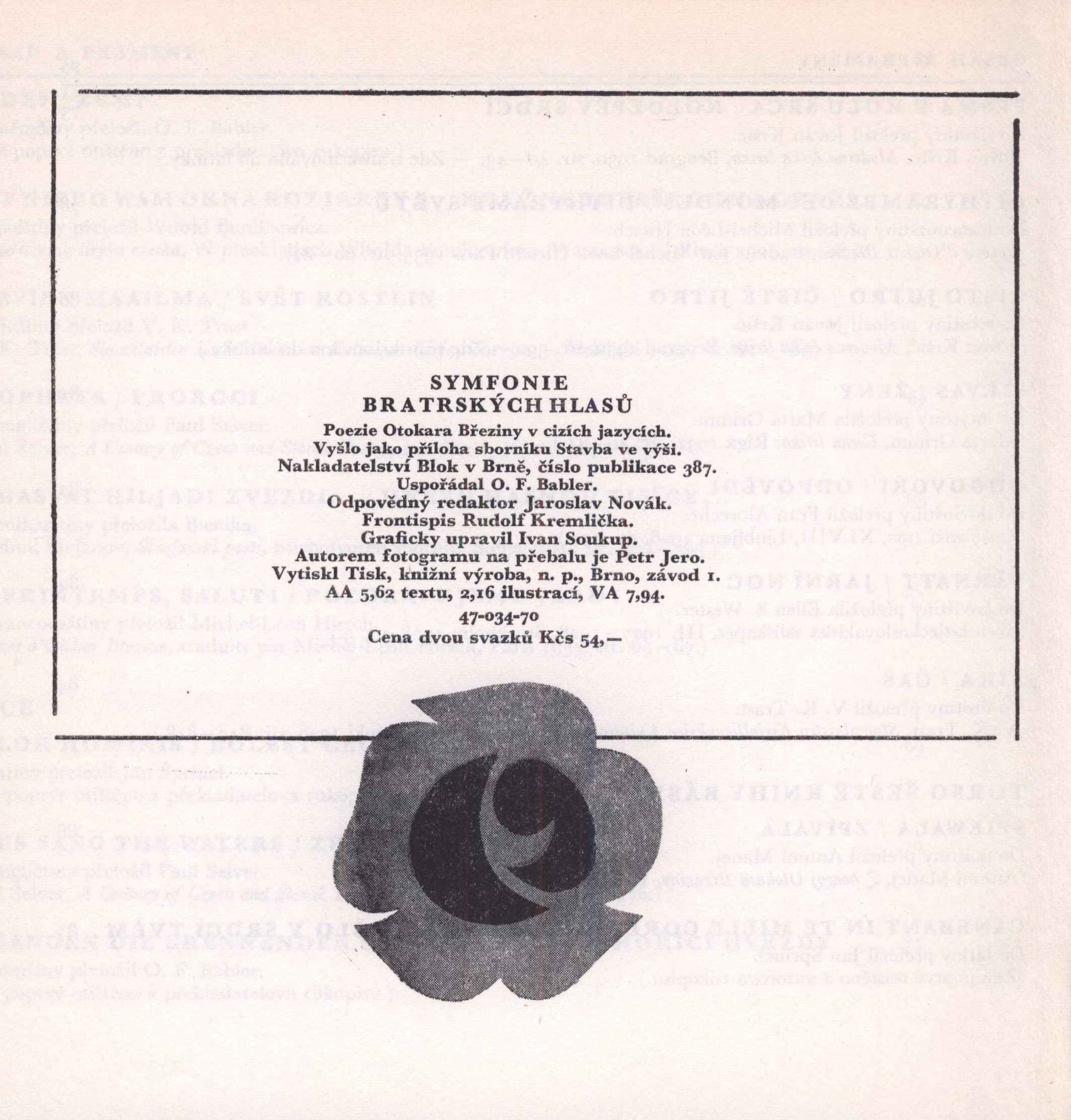 Title information Symfonie bratrských hlasů : poezie Otokara Březiny v cizích jazycích / Otokar Březina ; uspořádal O.F. Babler ; frontispis Rudolf Kremlička ; graficky upravil Ivan Soukup ; autorem fotogramu na přebalu je Petr Jero Personal name Březina, Otokar, 1868-1929 (Author) Další autoři Babler, Otto František, 1901-1984 (Compiler) Kremlička, Rudolf, 1886-1932 (Illustrator) Soukup, Ivan, 1942- (Book designer) Jero, Petr, 1951- (Illustrator) (Bookjacket designer) Corporation Blok (nakladatelství) (Publisher) Tisk Brno (tiskárna) (Printer) Publication V Brně : Blok, 1970 Manufacture Tisk, knižní výroba, n. p., závod 1 Scope 95 stran ; 20,5 x 20,5 cm ISBN (Vázáno) Country Czech Republic Language Miscellaneous languages Language of the original Czech Note Zdobený barevný přebal a vazba. - Šedé předsádky. - Frontispis (litografie - portrét Otokara Březiny). - Zdobený dvoubarevný titulní list. - Obsah a prameny. - Zdobená tiráž.