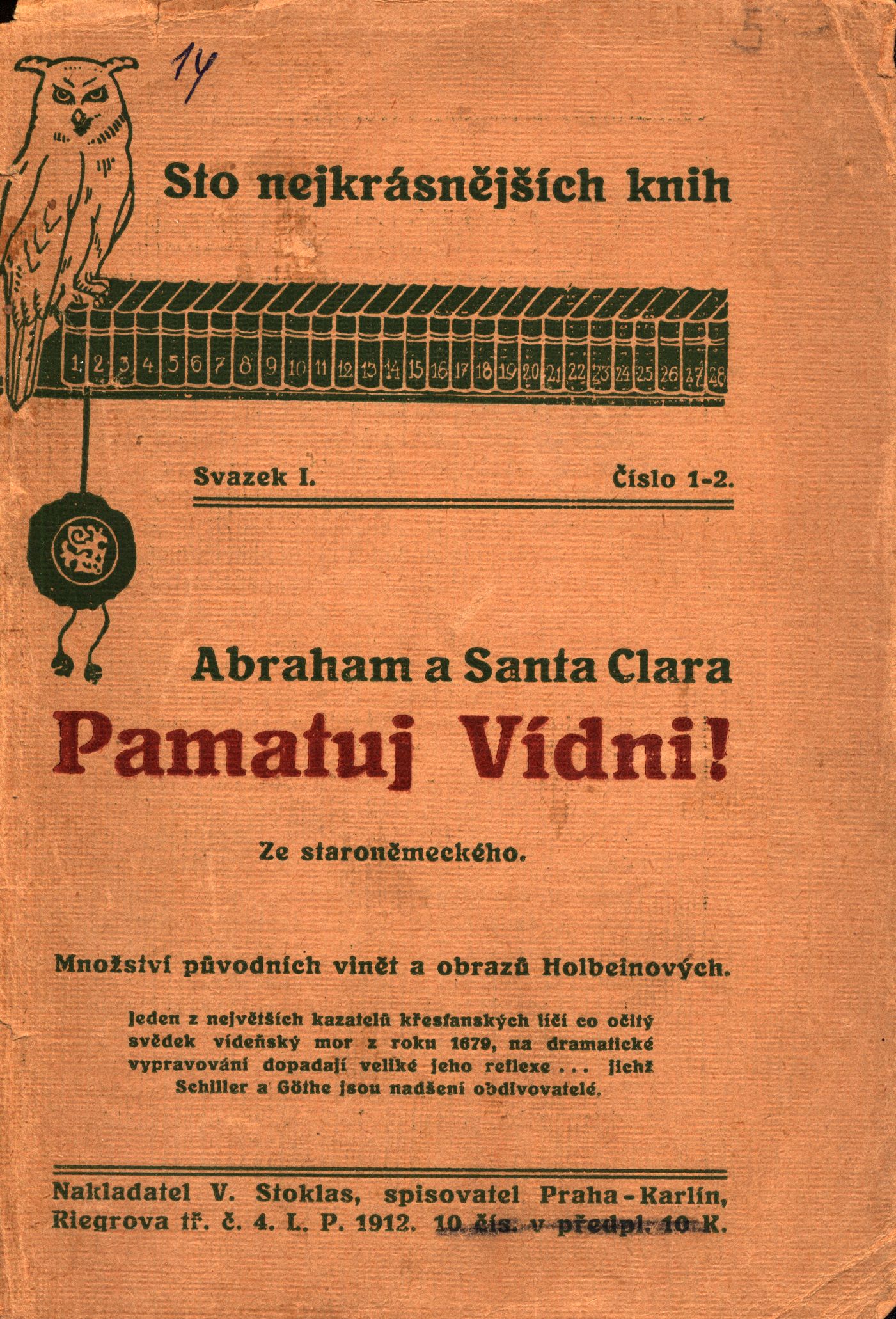 Title information Pamatuj Vídni! : s množstvím původních vinět a obrazů H. Holbeina /ze staroněmeckého [přeložil] V. Stoklas Abraham a Santa Clara ; ze staroněmeckého [přeložil] V. Stoklas Author Abraham a Sancta Clara, 1644-1709 (Author) Další autoři Stoklas, Václav, -1919 (Translator) (Publisher) Corporation L. Štorkán a Al. Jaroš (tiskárna) (Printer) Publication Praha-Karlín : Václav Stoklas, 1912 Manufacture V Žižkově : L. Štorkán a Al. Jaroš Scope 165 stran, 4 listy obrazových příloh : ilustrace ; 17,5 cm ISBN (Brožováno) Edition Sto nejkrásnějších knih ; svazek 1. Číslo 1, 2