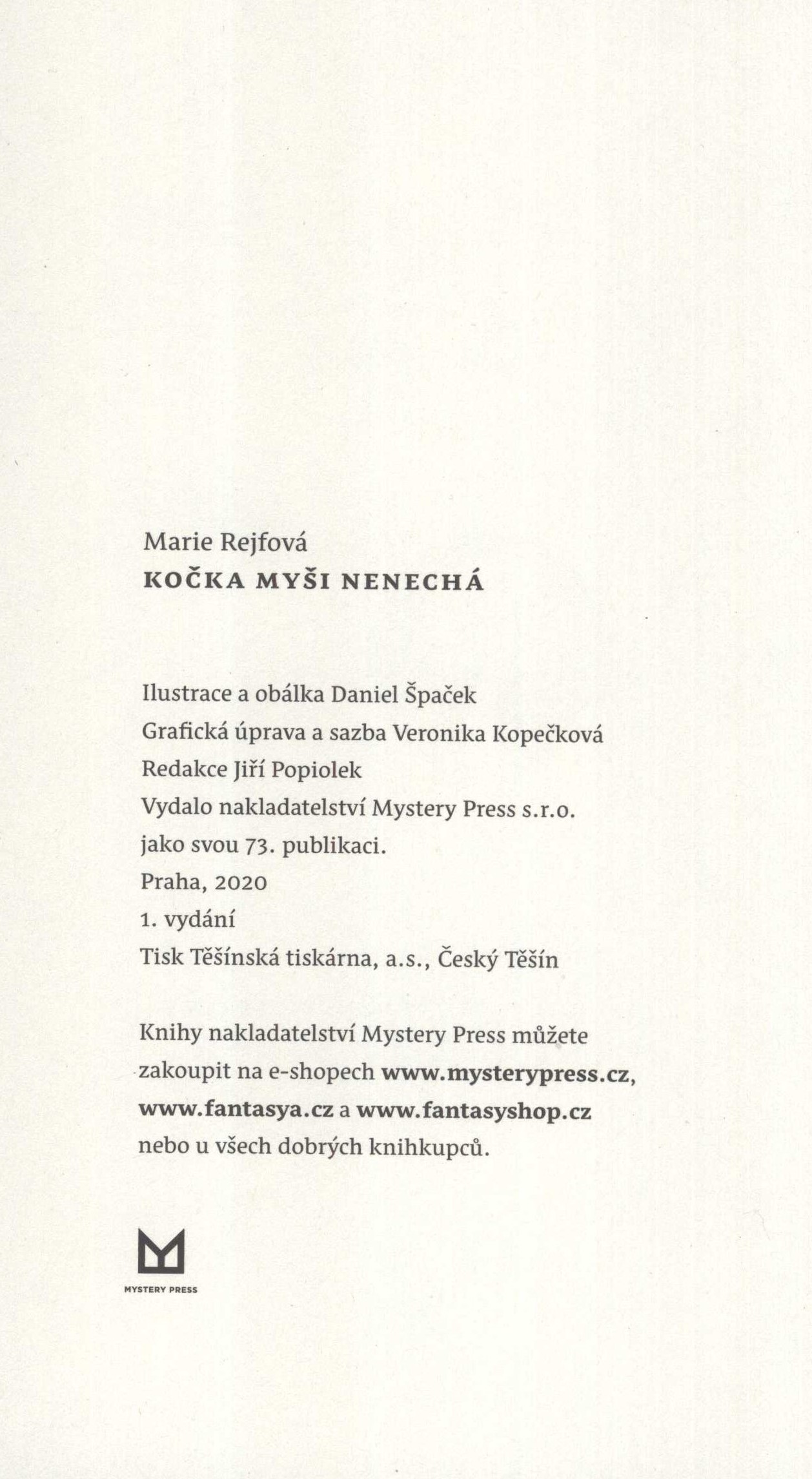 Title information Kočka myši nenechá / Marie Rejfová ; ilustrace a obálka Daniel Špaček ; grafická úprava a sazba Veronika Kopečková Personal name Rejfová, Marie, 1976- (Author) Další autoři Špaček, Daniel, 1977- (Illustrator) (Bookjacket designer) Kopečková, Veronika, 1977- (Book designer) (Compositor) Corporation Mystery Press (nakladatelství) (Publisher) Těšínská tiskárna (Printer) Edition statement 1. vydání Publication Praha : Mystery Press, 2020 Manufacture Český Těšín : Těšínská tiskárna, a.s. Scope 253 stran : ilustrace ; 21 cm ISBN 978-80-7588-183-0 (vázáno) Country Czech Republic Language Czech Note Bílá obálka s barevnou ilustrací, dvoubarevný text; dvoubarevný text a nakladatelská značka na hřbetu. - Na přední záložce text o hlavní hrdince knihy, na zadní stručná biografie autorky a její kreslený portrét. - Zelená vazba s černou ilustrací, černý text; černý text a nakladatelská značka na hřbetu. - Černé předsádky zdobené otisky bílých tlapek. - Rozložený titulní list s nakladatelskou značkou. - Přehled autorčiných knih. - Černé listy s drobnou bílou ilustrací (oddělují jednotlivé denní záznamy). - Odkaz na blog hlavní hrdinky Josefíny. - Nakladatelská značka v tiráži. - Anotace knihy, drobné barevné ilustrace a internetové odkazy na zadní straně obálky. - Přebal.