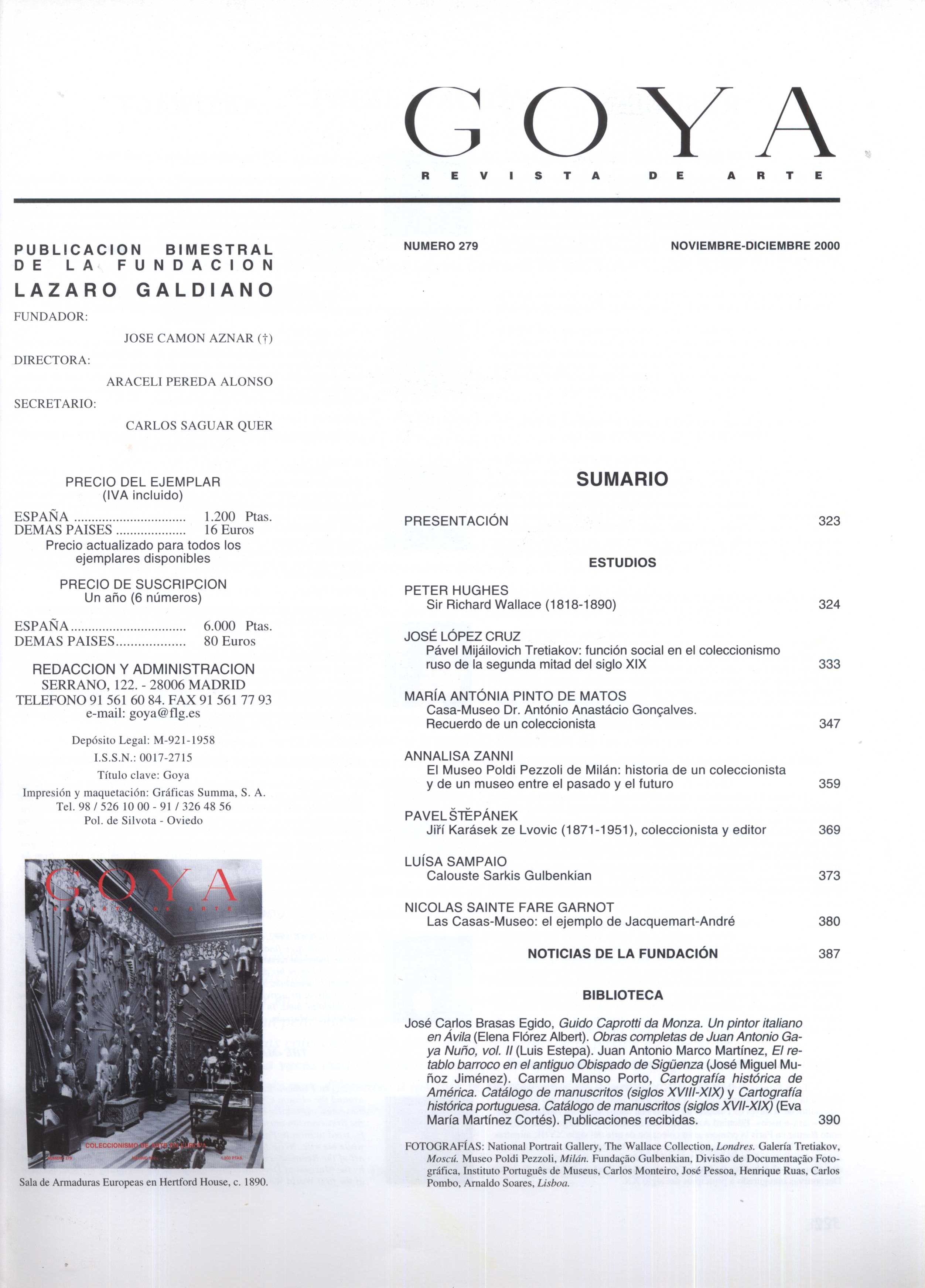 Title information Goya : revista de arte Roč., číslo Numero 279, 2000 Publication Madrid : Fundacion Lazaro Galdiano, 2000 Scope Strana 323-392 : fotografie, portréty, ilustrace ; 31 cm ISSN 0017-2715 Country Spain Language Spanish Note Převážně barevné fotografie, portréty a ilustrace. - Monograficky zaměřené číslo s názvem: Coleccionismo de arte en Europa