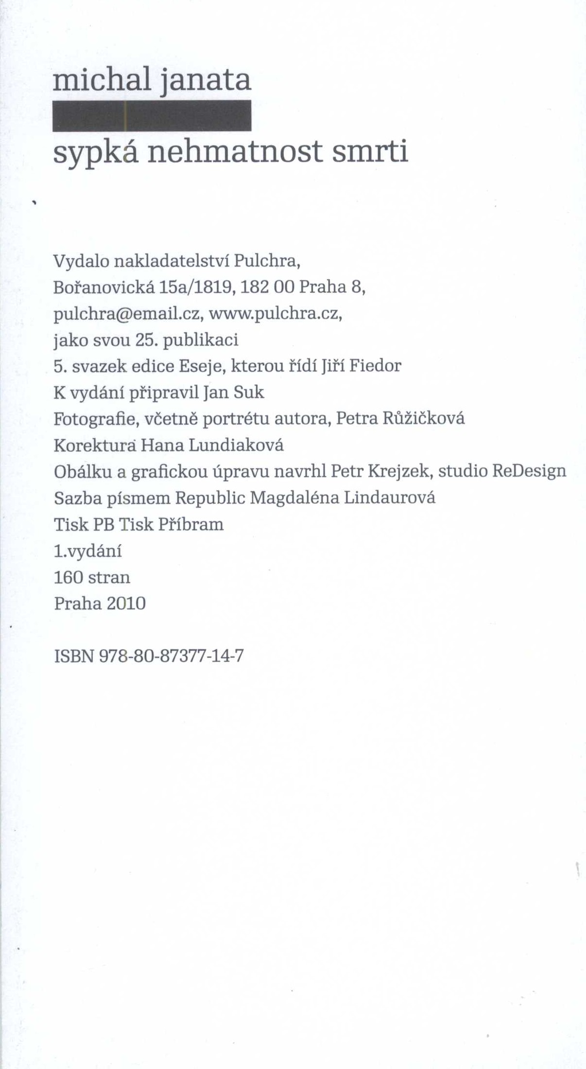 Title information Sypká nehmatnost smrti / Michal Janata Personal name Janata, Michal, 1952- (Author) Další autoři Suk, Jan, 1951-2025 (Editor) Růžičková, Petra, 1963-2021 (Photographer) Krejzek, Petr, 1965- (Bookjacket designer) (Book designer) Lindaurová, Magdaléna, 1987- (Compositor) Corporation Pulchra (nakladatelství) (Publisher) PBtisk (tiskárna) (Printer) (Printer of plates) Publication Praha : Pulchra, 2010 Manufacture [Příbram] : PB Tisk Příbram Scope 158 stran : ilustrace ; 19 cm Personal subjects Janata, Michal, 1952- - nakladatelský redaktor, teoretik a kritik architektury a fotografie, kulturní historik, výtvarný publicista Subject headings smrt - filozofické pojetí * death - philosophical approach Keywords česká literatura * próza * autobiografické prvky * Janata M. * motiv smrti Copy cnt. 1, currently available 1 URL http://krameriusndk.nkp.cz/search/handle/uuid:a79d2300-8034-11eb-93ce-005056827e51 Document kind monografie Call number R&AHamanovi 1203