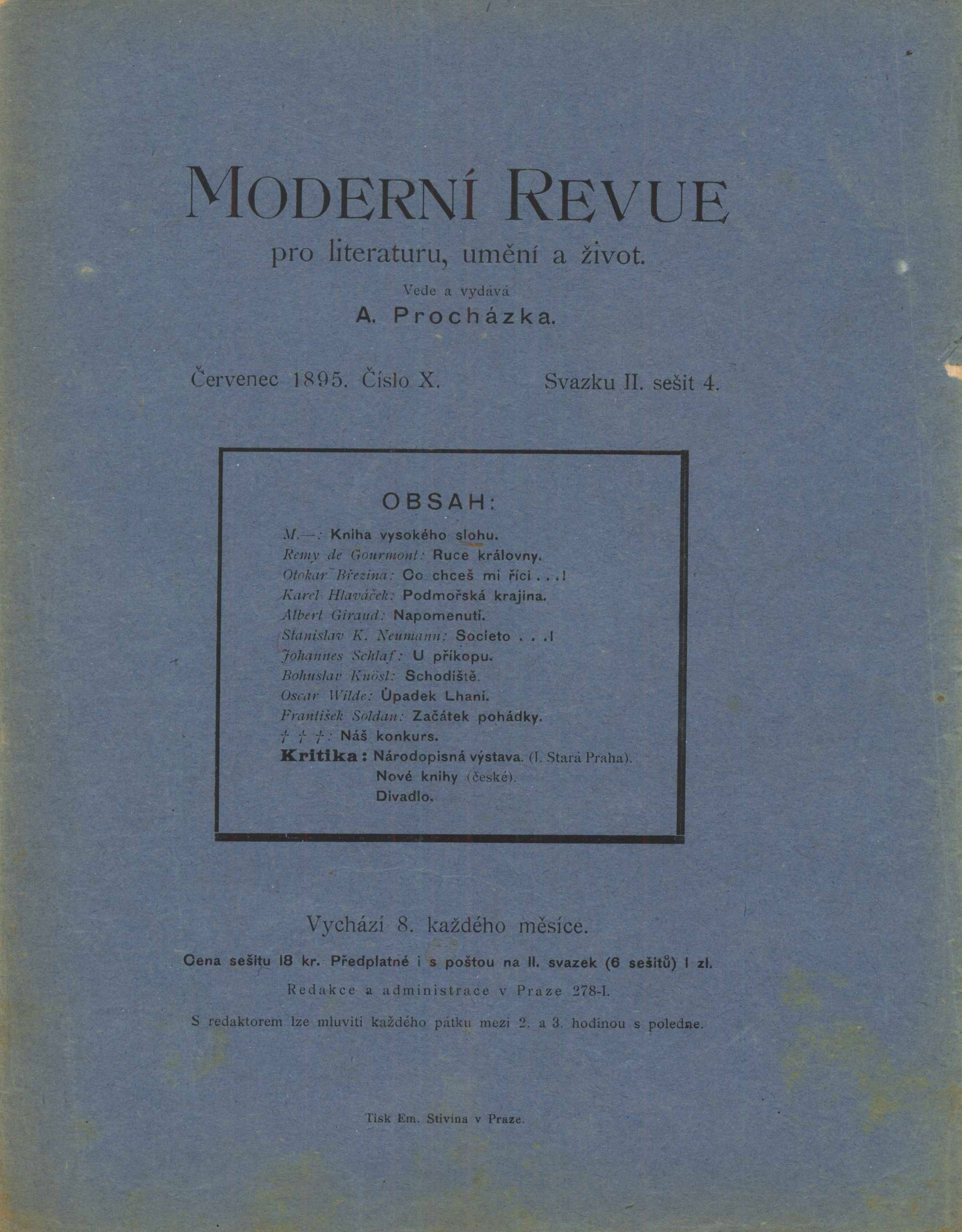 Title information Moderní revue : pro literaturu, umění a život Další autoři Procházka, Arnošt, 1869-1925 (Redactor) (Publisher) Stivín, Emanuel, 1848-1925 (Printer) Roč., číslo [Ročník 1], svazek 2, sešit 1-6, 1895 Publication V Praze : Arnošt Procházka, 1895 Manufacture Tiskem Em. Stivína Scope 140 stran ; 24 cm Country Czech Republic Language Czech Note Průběžné stránkování