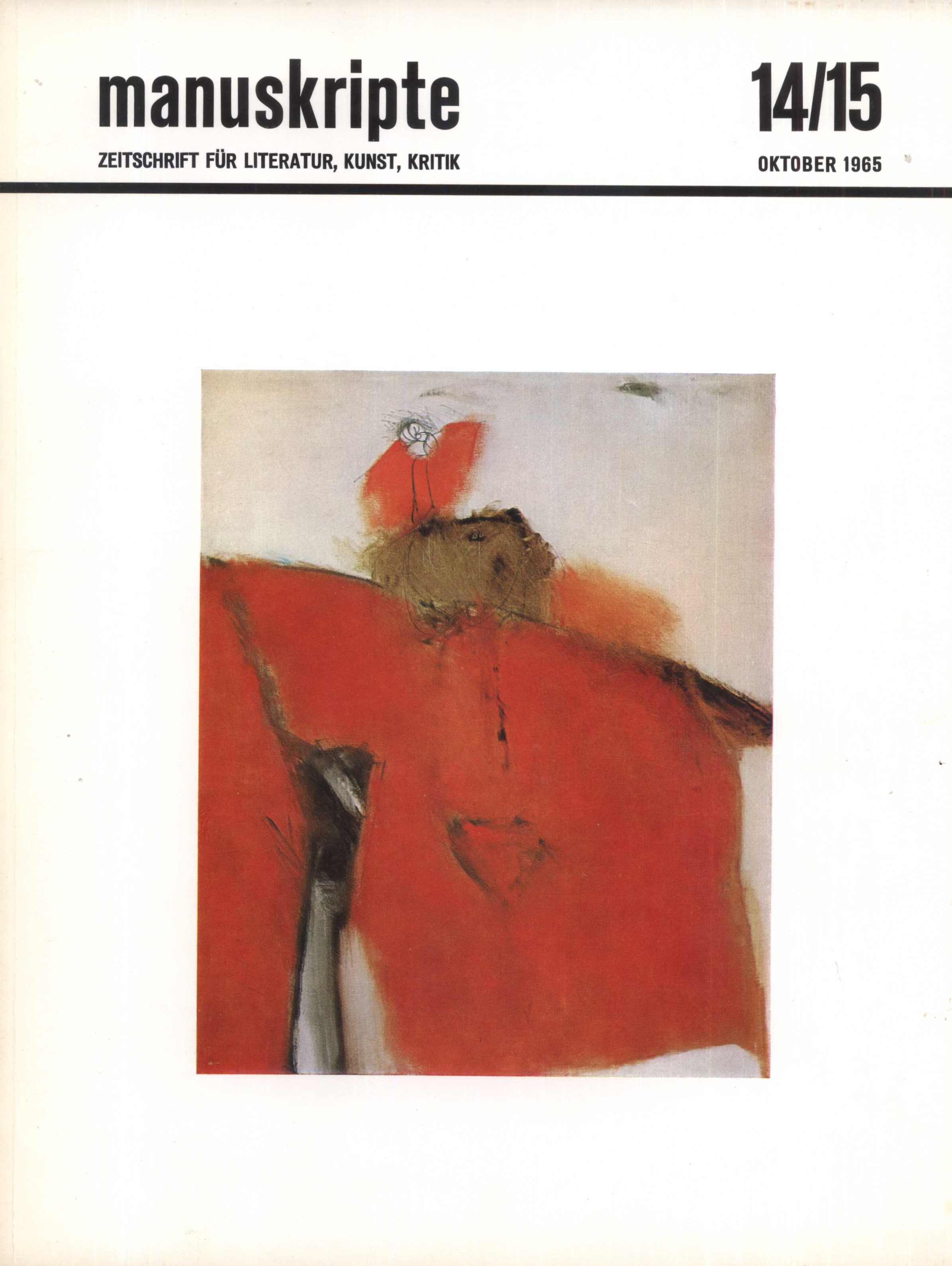 Manuskripte : Zeitschrift für Literatur, Kunst und Kritik. -- Ročník 5, číslo 14/15 (1965). -- Graz : Forum Stadtpark, 1965. -- Grazer Druckerei. -- 46 stran : ilustrace ; 27 cm. -- Barevná obálka. - Čb. ilustrace. -- Redakce: Alfred Kolleritsch, Günter Waldorf. -- 14/15 (říjen 1965; v rámci ročníku sešit 2/3). -- ISSN : 0025-2638.