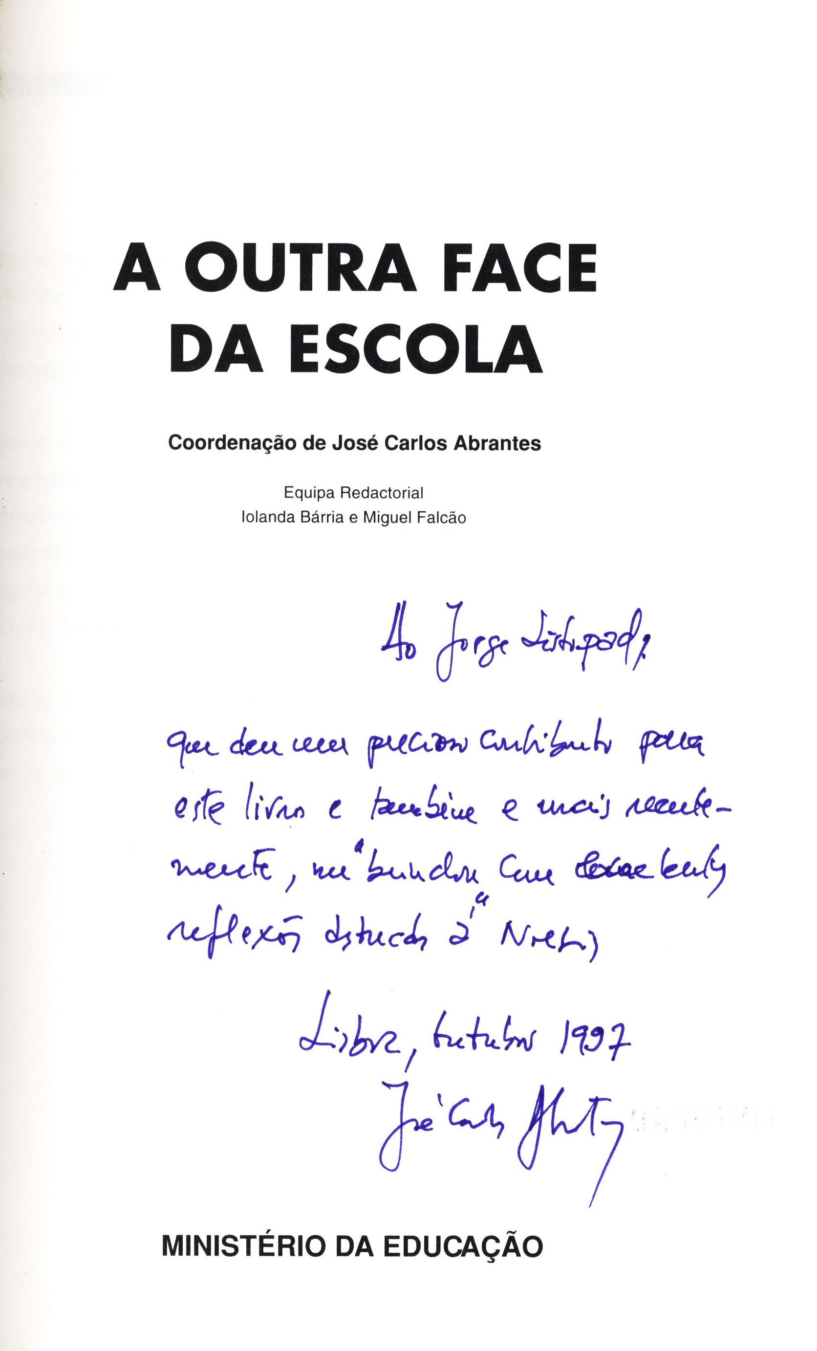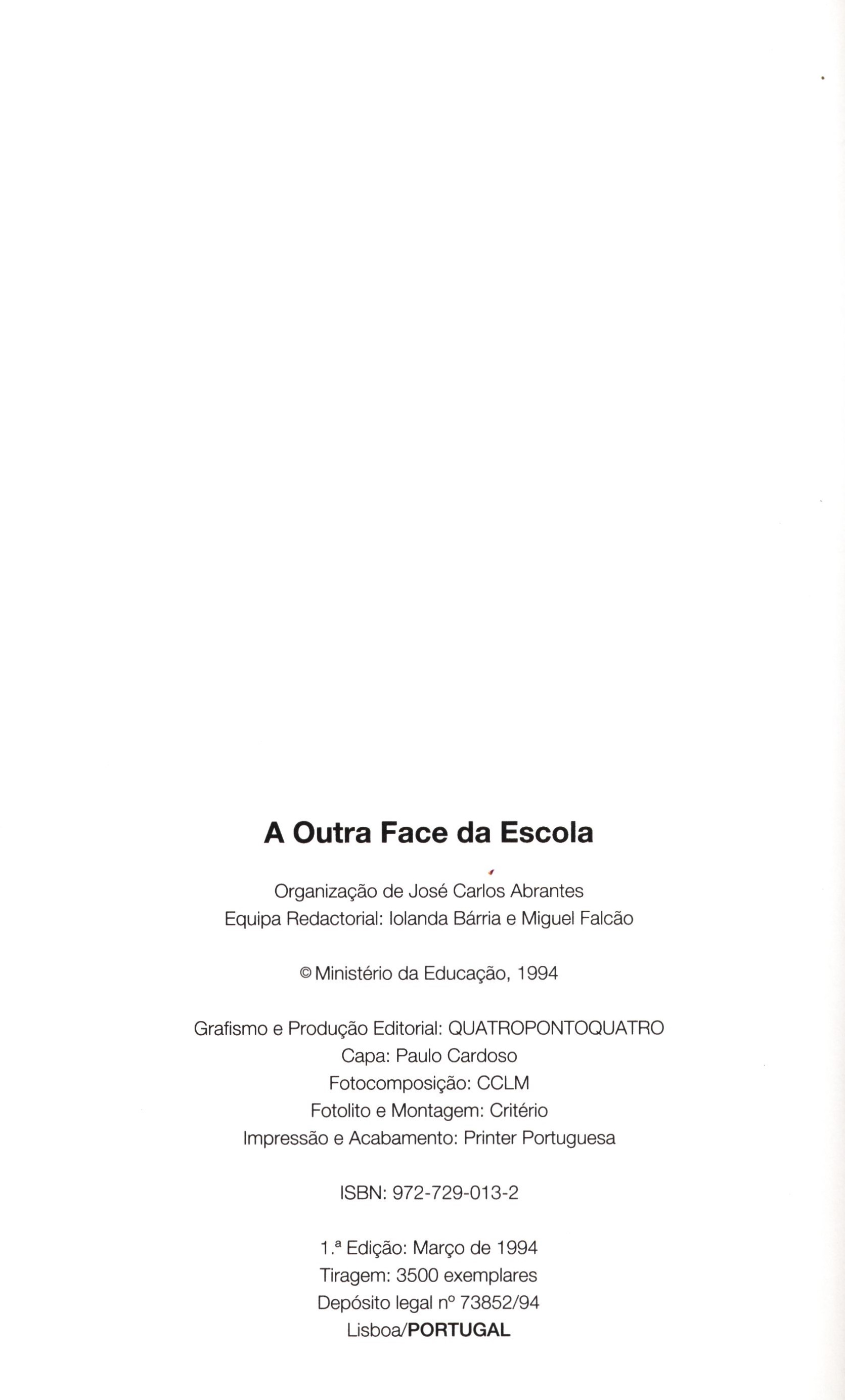 Title information A outra face da escola / coordenação de José Carlos Abrantes Další autoři Abrantes, José Carlos (Editor) (Dedicator) Listopad, František, 1921-2017 (Dedicatee) Corporation Portugalsko. Ministério da Educação (Publisher) Publication Lisboa : Ministério da Educação, 1994 Manufacture Printer Portuguesa Scope 724 stran : fotografie, ilustrace ; 24 cm ISBN 972-729-013-2 (brožováno) Country Portugal Language Portuguese Note Barevná fotografická obálka. - Titulní list. - Obsah. - Poznámky pod čarou. - Černobílé fotografie a ilustrace. - Rejstříky.