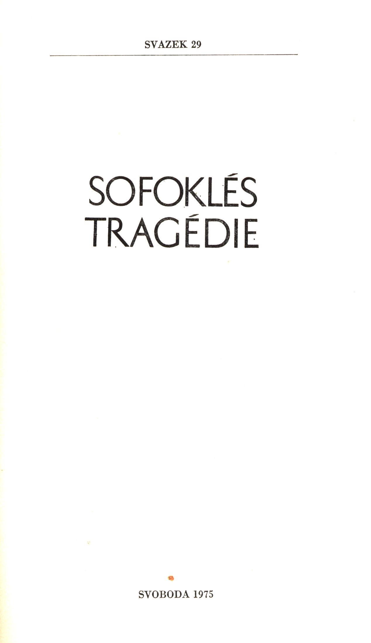 1. Title informationTragédie / Sofoklés ; z komentovaných řeckých originálů Shopoclis tragoediae ... přeložili Ferdinand Stiebitz, Václav Dědina a Radislav Hošek ; předmluva Bořivoj Borecký ; obálku, vazbu a grafickou úpravu navrhl Leo Novotný