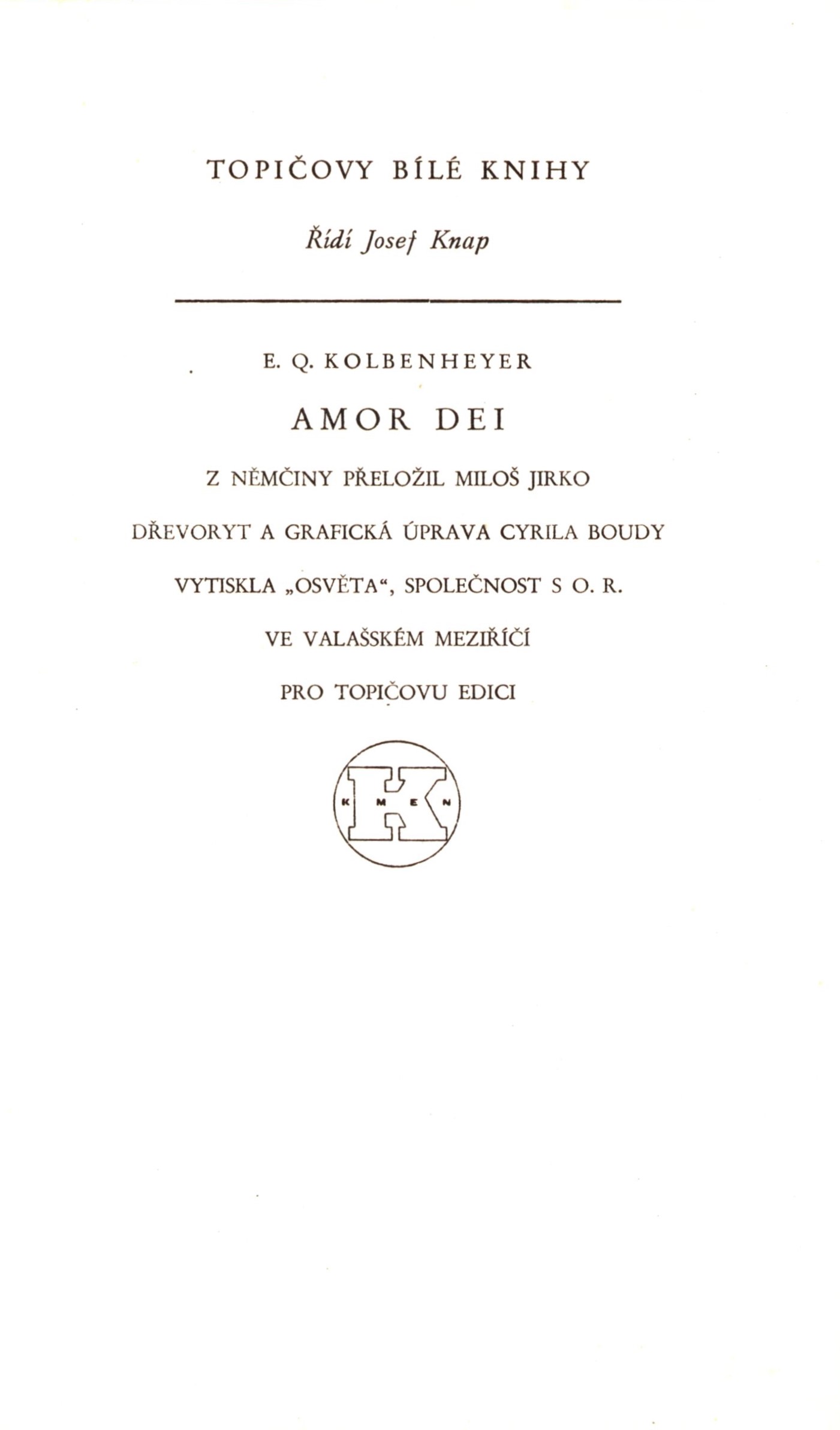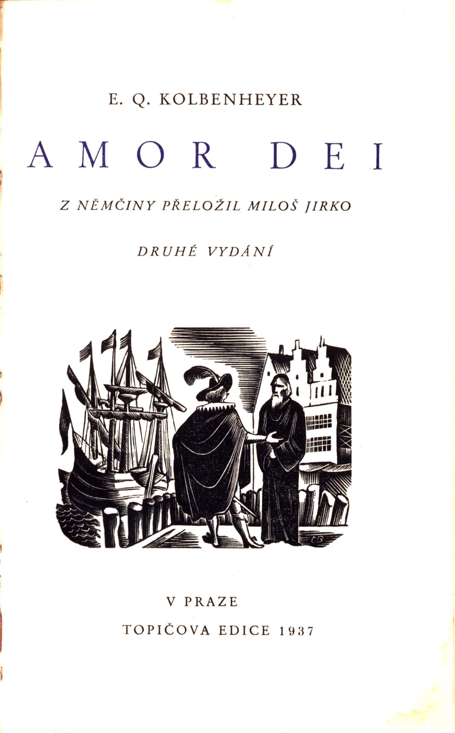 Title information Amor Dei / E.Q. Kolbenheyer ; z němčiny přeložil Miloš Jirko ; dřevoryt a grafická úprava Cyrila Boudy Personal name Karst, Sebastian, 1878-1962 (Author) Další autoři Jirko, Miloš, 1900-1961 (Translator) Bouda, Cyril, 1901-1984 (Book designer) (Illustrator) Corporation Topičova edice (nakladatelství) (Publisher) Osvěta (tiskárna) (Printer) Edition statement druhé vydání Publication V Praze : Topičova edice, 1937 Manufacture Ve Valašském Meziříčí : Osvěta Scope 313 stran ; 22 cm ISBN (Vázáno) Edition Topičovy bílé knihy