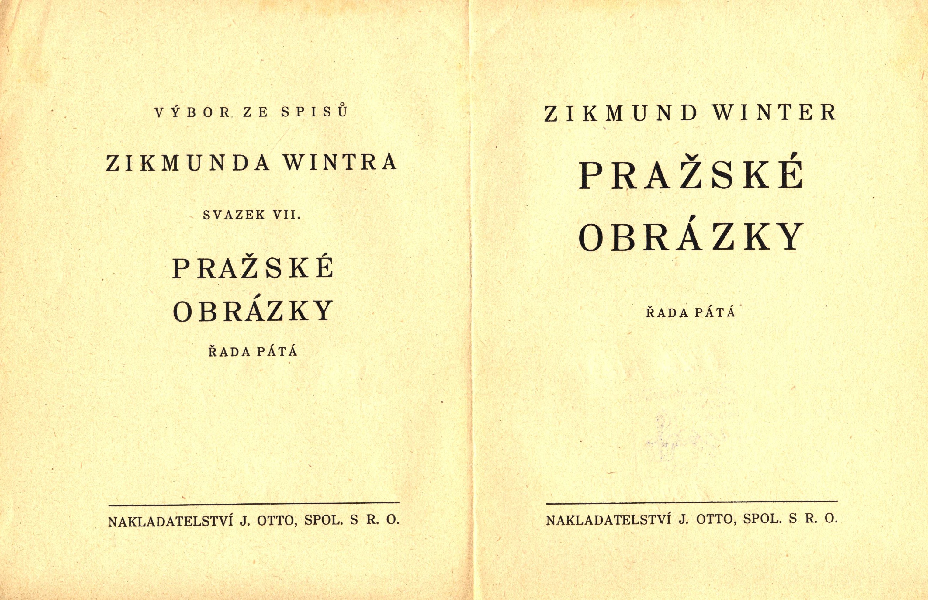 Title information Pražské obrázky. Řada pátá / Zikmund Winter Personal name Winter, Zikmund, 1846-1912 (Author) Další autoři J. Otto (nakladatelství) (Publisher) Unie (tiskárna) (Printer) Publication V Praze : a Bratislavě : Nakladatelství J. Otto, spol. s r.o., 1929 Manufacture Tiskem Unie Scope strana 129-360 v 5 sešitech ; 19 cm ISBN (Brožováno) Edition Výbor ze spisů Zikmunda Wintra, (J. Otto, spol. s r.o.) ; svazek VII, sešit 52-56