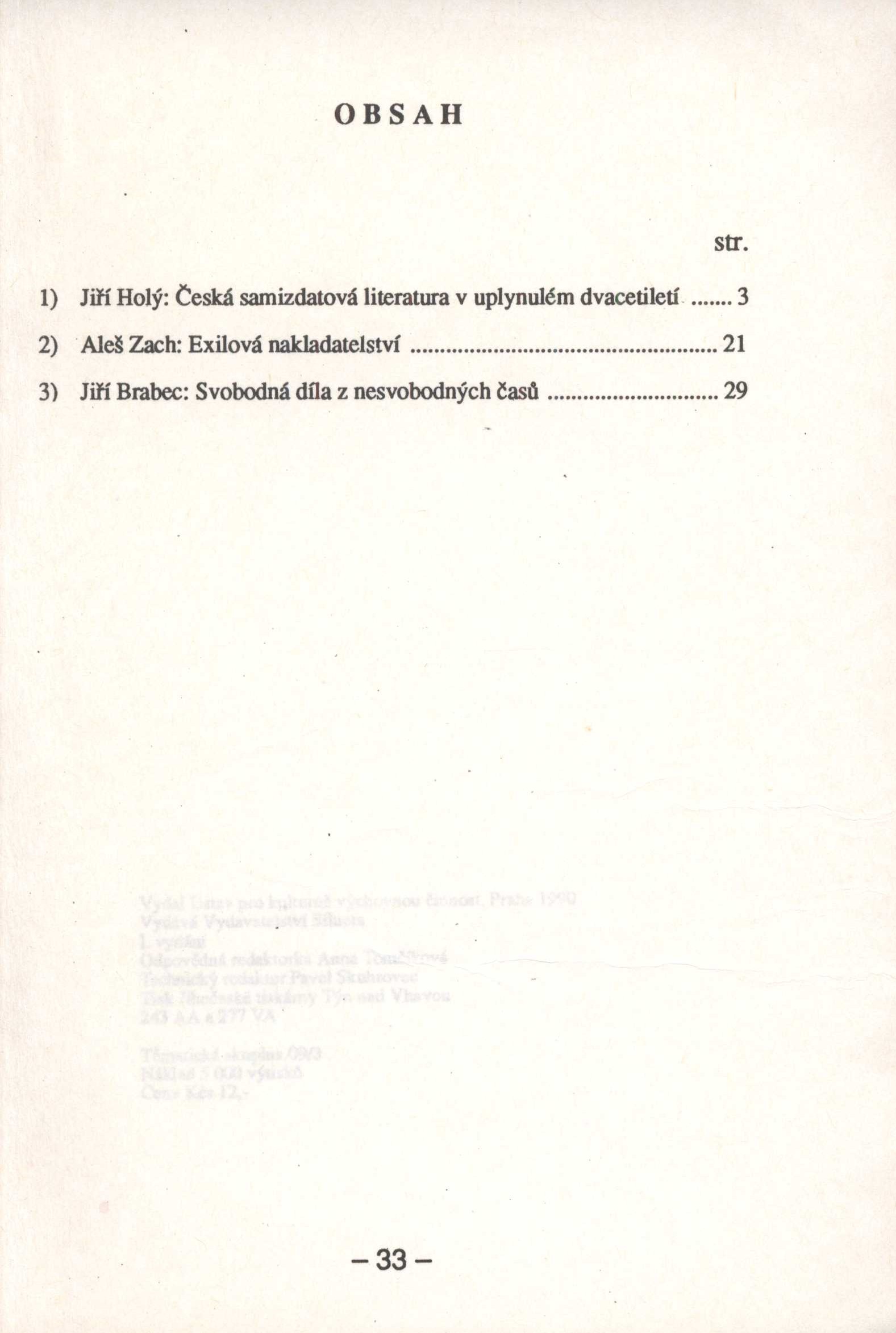 ContentsČeská samizdatová literatura v uplynulém dvacetiletí / Jiří Holý. Exilová nakladatelství / Aleš Zach. Svobodná díla nesvobodných časů / Jiří Brabec