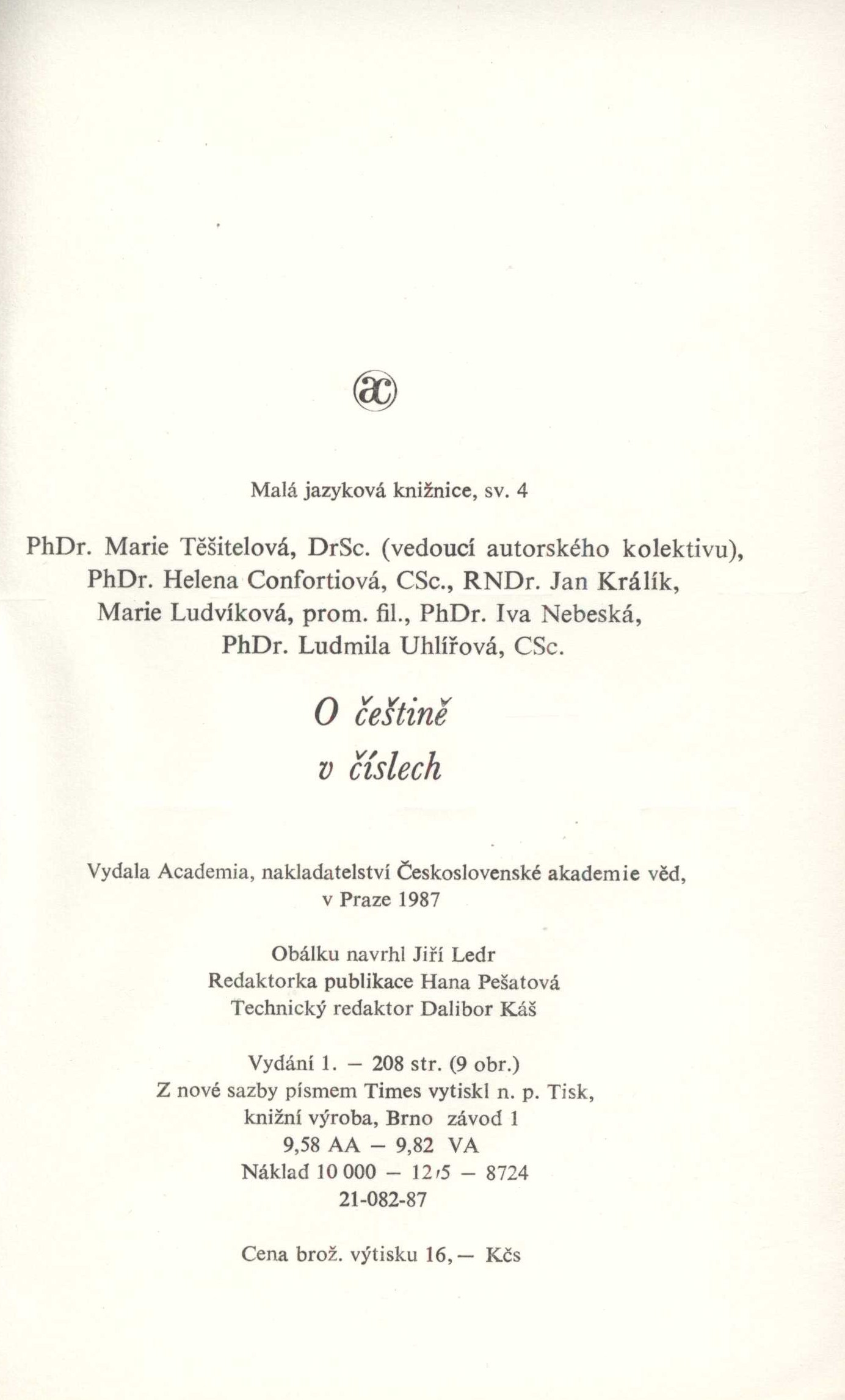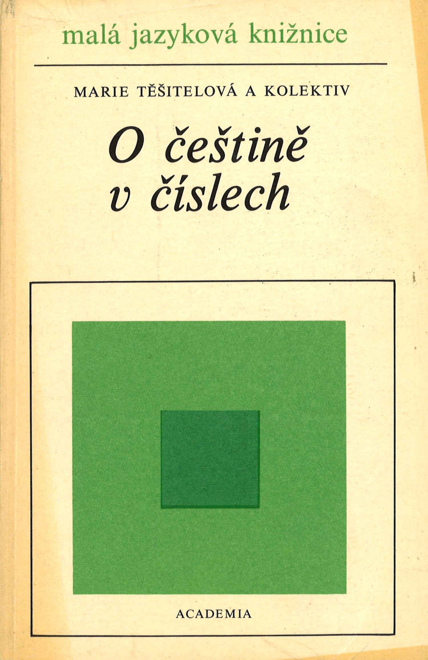 Title information O češtině v číslech / Marie Těšitelová a kolektiv ; obálku navrhl Jiří Ledr Personal name Těšitelová, Marie, 1921-2011 (Author) Další autoři Ledr, Jiří, 1921- (Bookjacket designer) Corporation Academia (nakladatelství) (Publisher) Tisk Brno (tiskárna) (Printer) Edition statement Vydání 1. Publication Praha : Academia, 1987 Manufacture Brno : Tisk, n. p., knižní výroba, závod 1 Scope 205 stran : ilustrace ; 20 cm ISBN (Brožováno) Edition Malá jazyková knižnice ; sv. 4