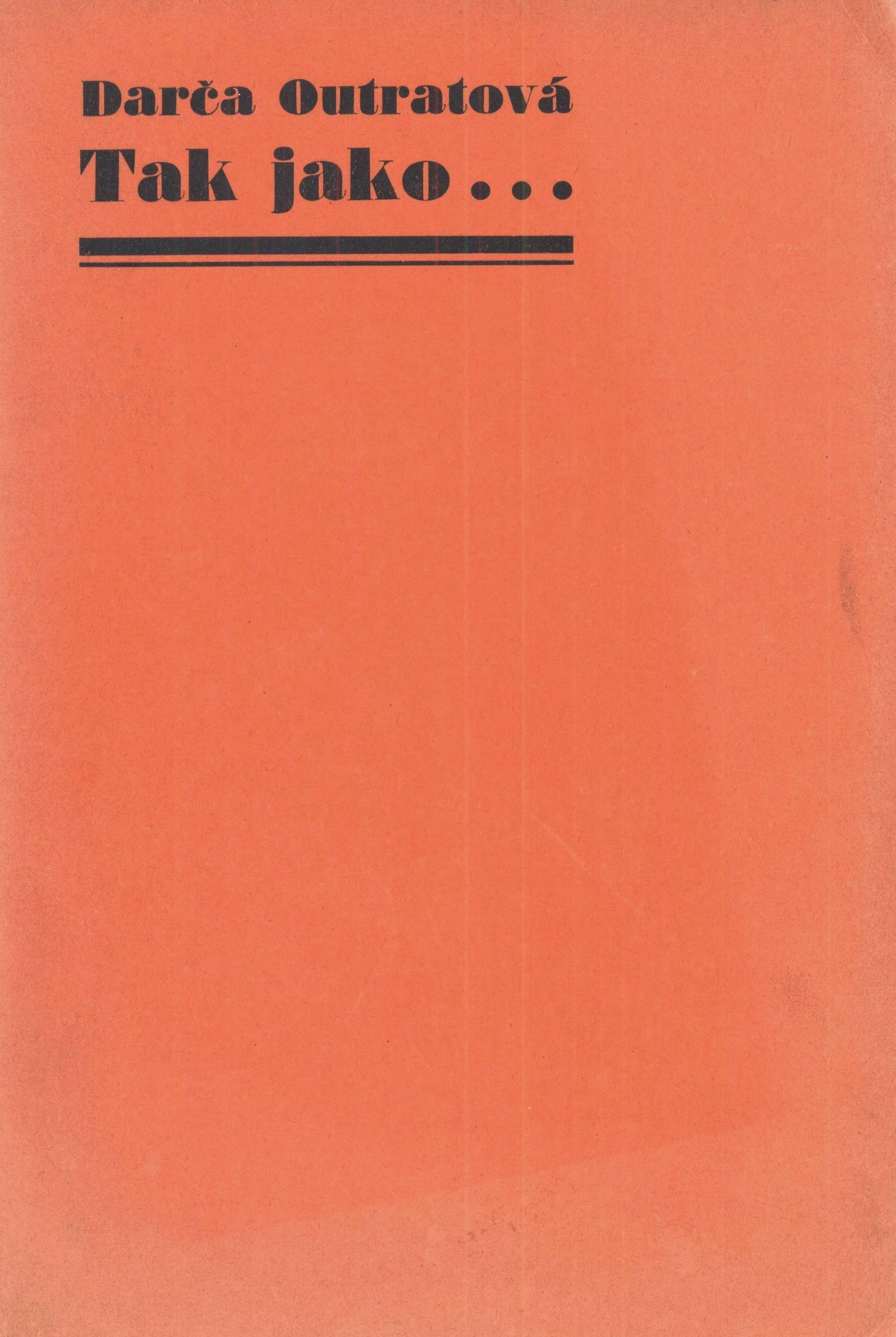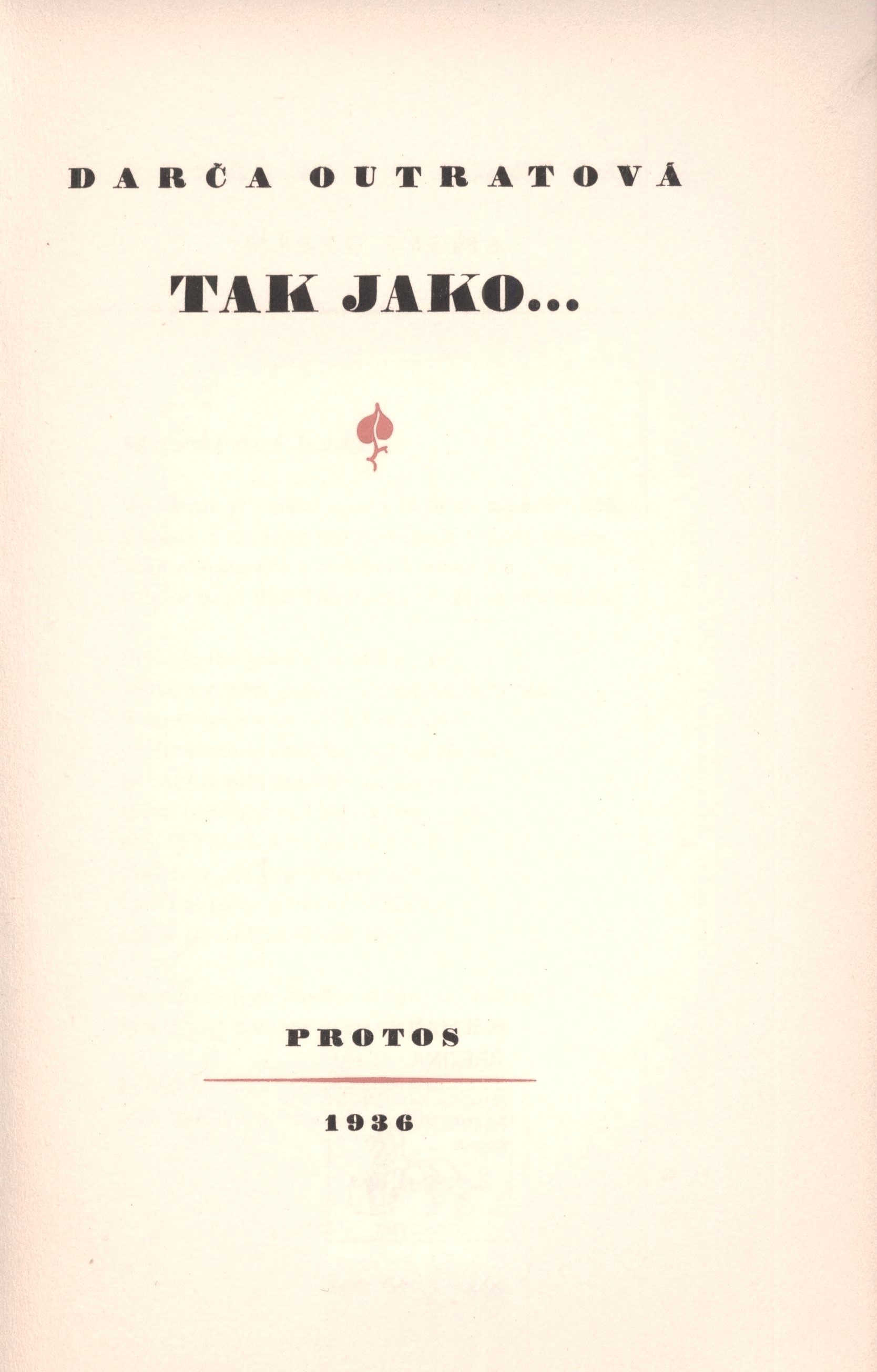 Title information Tak jako ... / Darča Outratová ; perokresby Ivana Haussmanna Personal name Outratová, Dagmar, 1905-1968 (Author) (Inscriber) Další autoři Haussmann, Ivan, 1907-1944 (Illustrator) Toman, Prokop Hugo, 1902-1981 (Publisher) Corporation Karel Reyl (tiskárna) (Printer) Publication V Praze : Prokop Toman ml., 1936 Manufacture Dyrynkova tiskárna Karel Reyl Scope 69 stran : ilustrace ; 23 cm ISBN (Brožováno) Edition Protos ; 5. svazek