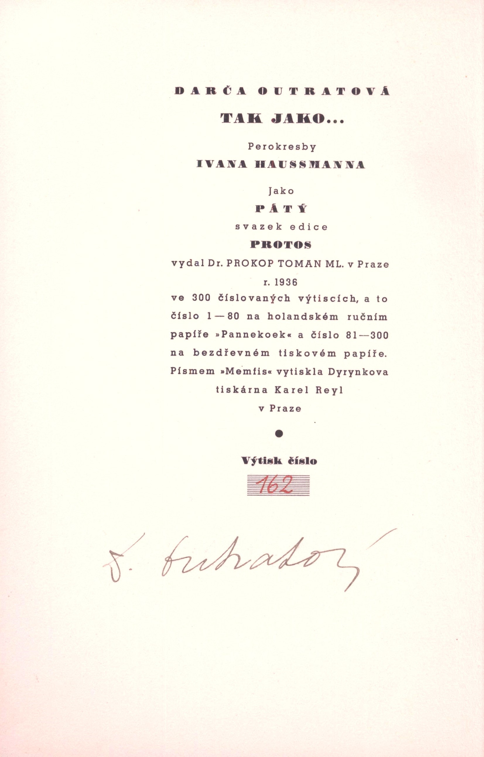 Protos, (Prokop Toman ml.)Country Czech Republic Language Czech Note Dvoubarevná typografická obálka. - Dvoubarevný titulní list. - Černobílé celostránkové ilustrace. - Obsah. - Tiráž s ručně vepsaným číslem výtisku. - Vydáno 300 číslovaných výtisků, a to číslo 1-80 na holandském ručním papíře Pannekoek a číslo 81-300 na bezdřevném tiskovém papíře.