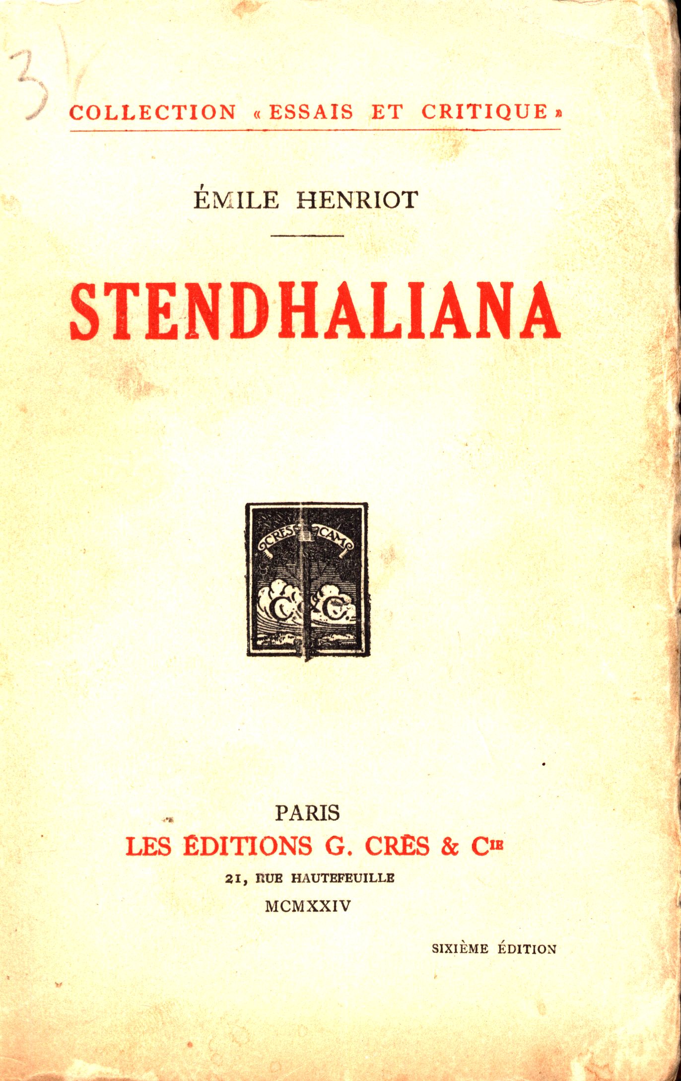 Title information Stendhaliana / Émile Henriot Personal name Henriot, Émile, 1889-1961 (Author) Další autoři Georges Crès et Cie (Paris, Francie) (Publisher) Edition statement Cinquième édition Publication Paris : Les Éditions G. Crès & Cie, 1924 Scope 235 stran ; 19 cm ISBN (vázáno) Edition Essais et critique
