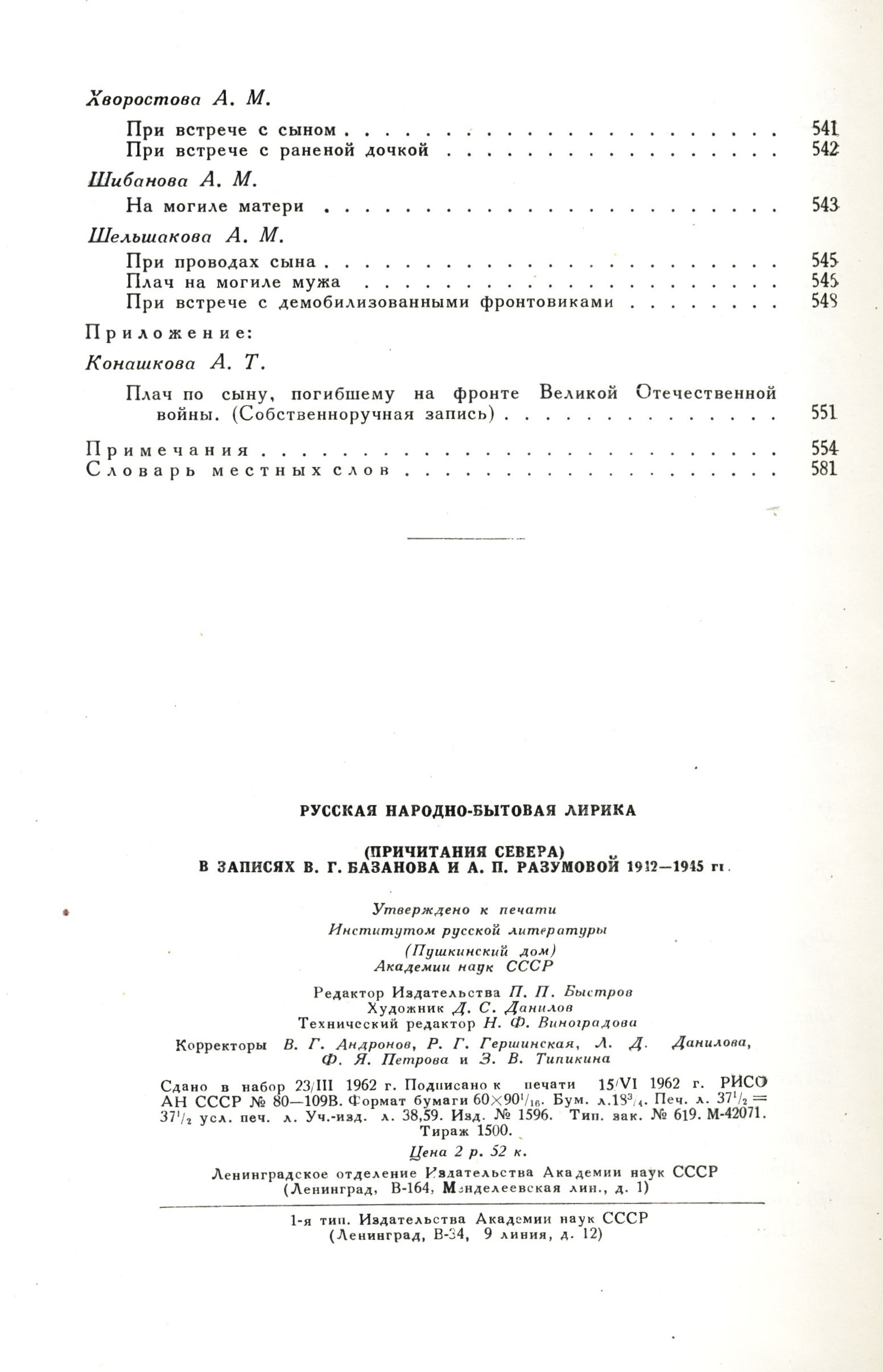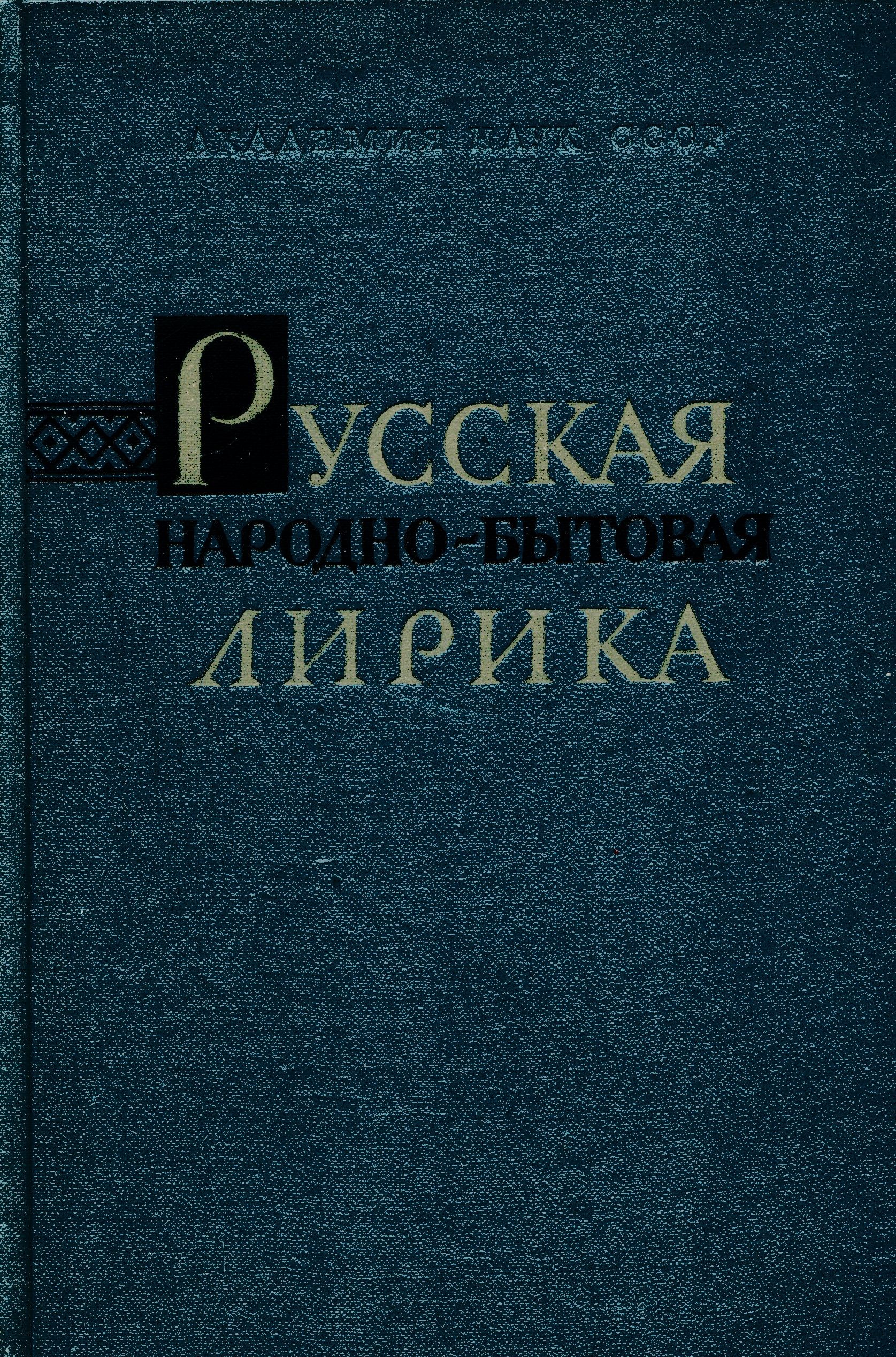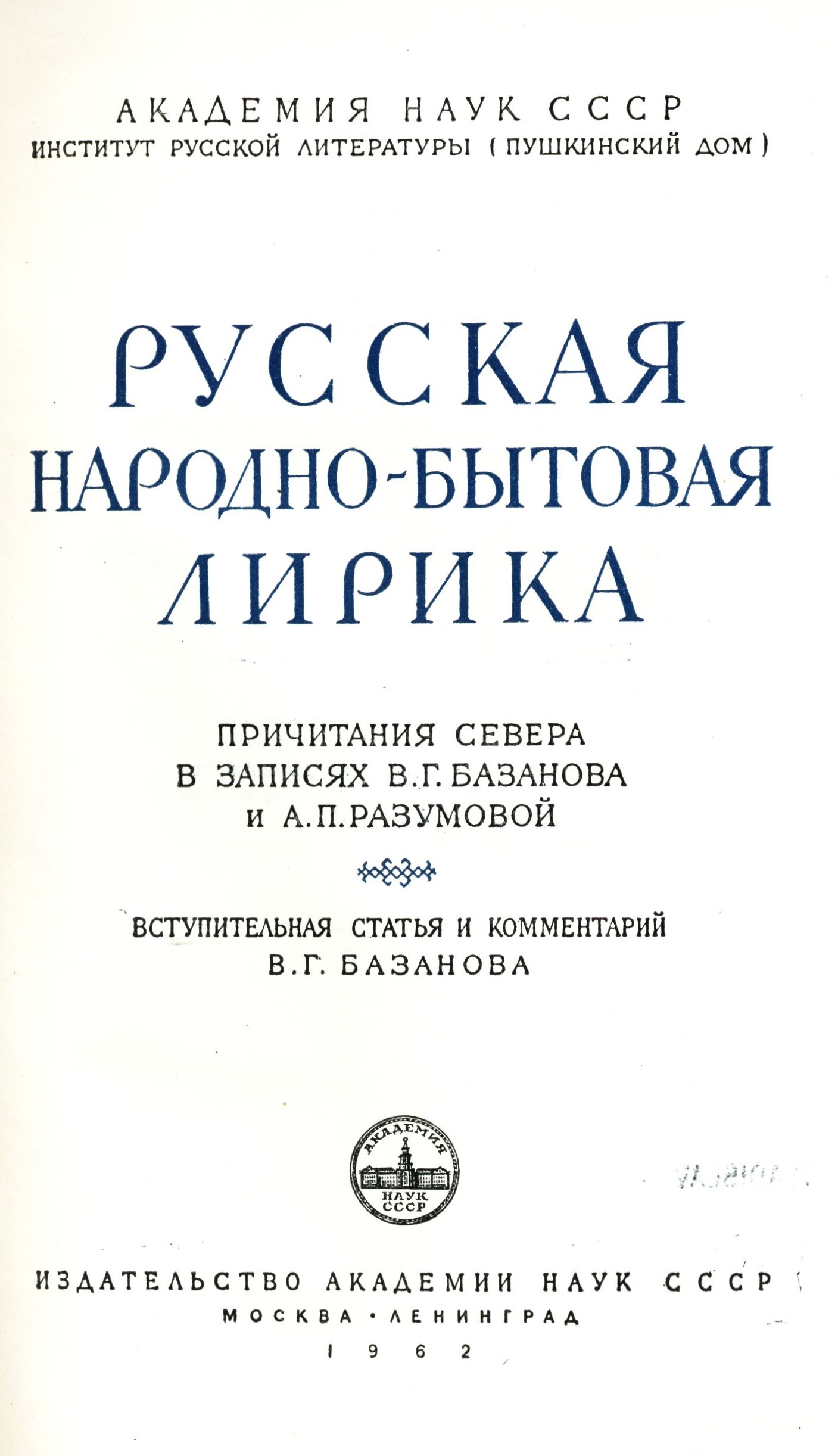 Title information Russkaja narodno- bytovaja lirika : pričitanija severa / v zapisjach V. G. Bazanova i A. P. Razumovoj; vstupitel'naja stat'ja i kommentarij V. G. Bazanova Personal name Bazanov, Vasilij Grigor'jevič, 1911-1981 (Compiler) (Author of introduction) Další autoři Razumova, A. P. (Commentator for written text) (Compiler) (Author of introduction) Corporation Izdatelstvo Akademii Nauk SSSR (nakladatelství) (Publisher) Publication Moskva-Leningrad : Izdatel'stvo akademii nauk SSSR, 1962 Scope 597 stran ; 22 cm ISBN (vázáno) Country Russia (Federation) Language Russian Note Modrá obálka s černou a zlatou řažbou písma. - Dvoubarevný text na titulním listu s nakladatelským signetem. - Obsah. - Tiráž. - Nakladatelská upoutávka.