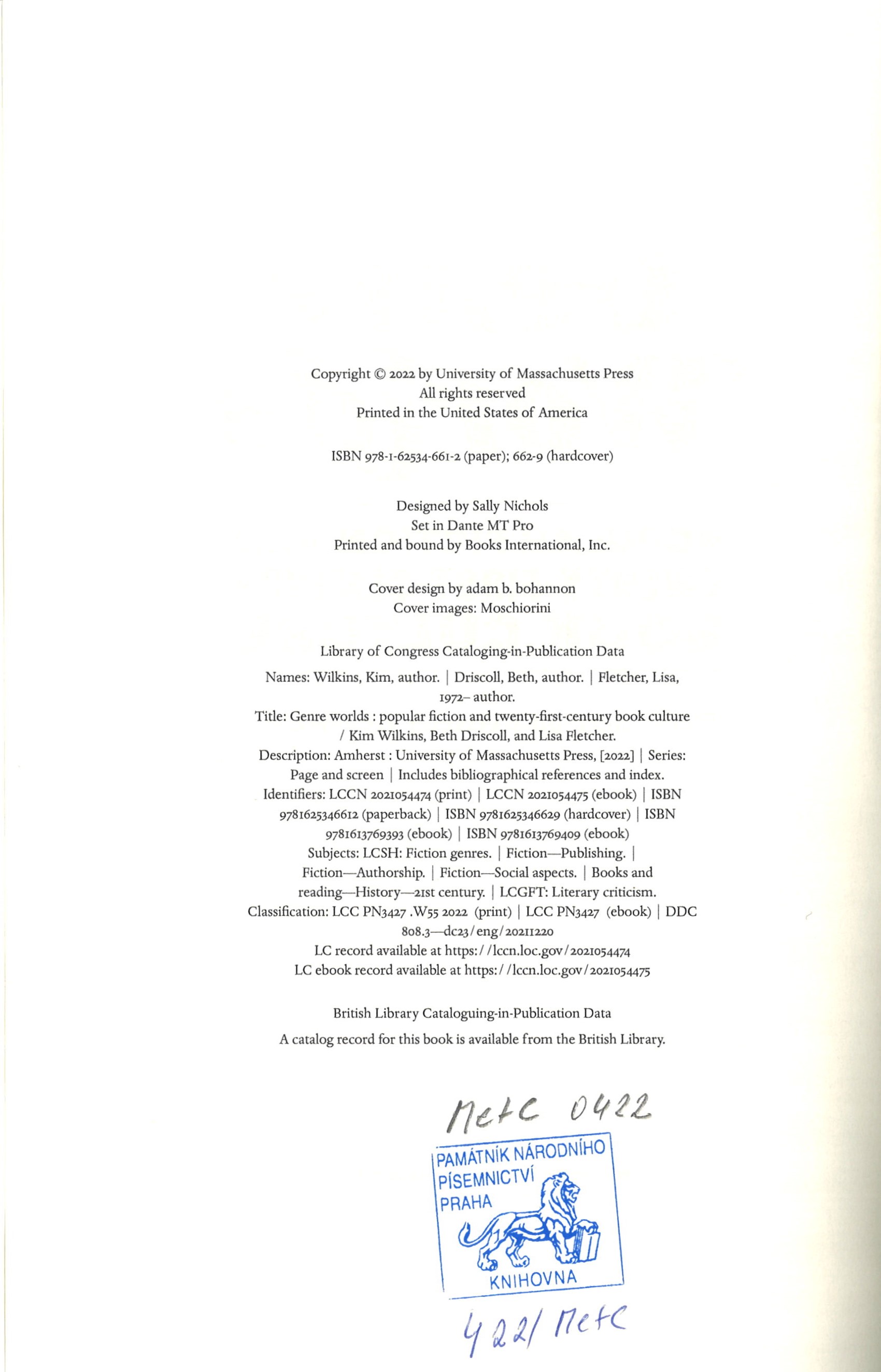 Title information Genre worlds : popular fiction and twenty-first-century book culture / Kim Wilkins, Beth Driscoll, Lisa Fletcher Personal name Wilkins, Kim, 1966- (Author) Další autoři Driscoll, Beth (Author) Fletcher, Lisa, 1972- (Author) Corporation University of Massachusetts Press (Publisher) Books International (Printer) Publication Amherst ; Boston : University of Massachusetts Press, [2022] Manufacture [Dulles] : Printed and bound by Books International, Inc. Copyright notice date ©2022 Scope xi, 233 stran : grafy, tabulka ; 23 cm ISBN 978-1-62534-661-2 (brožováno) Edition Page and screen, (University of Massachusetts Press)