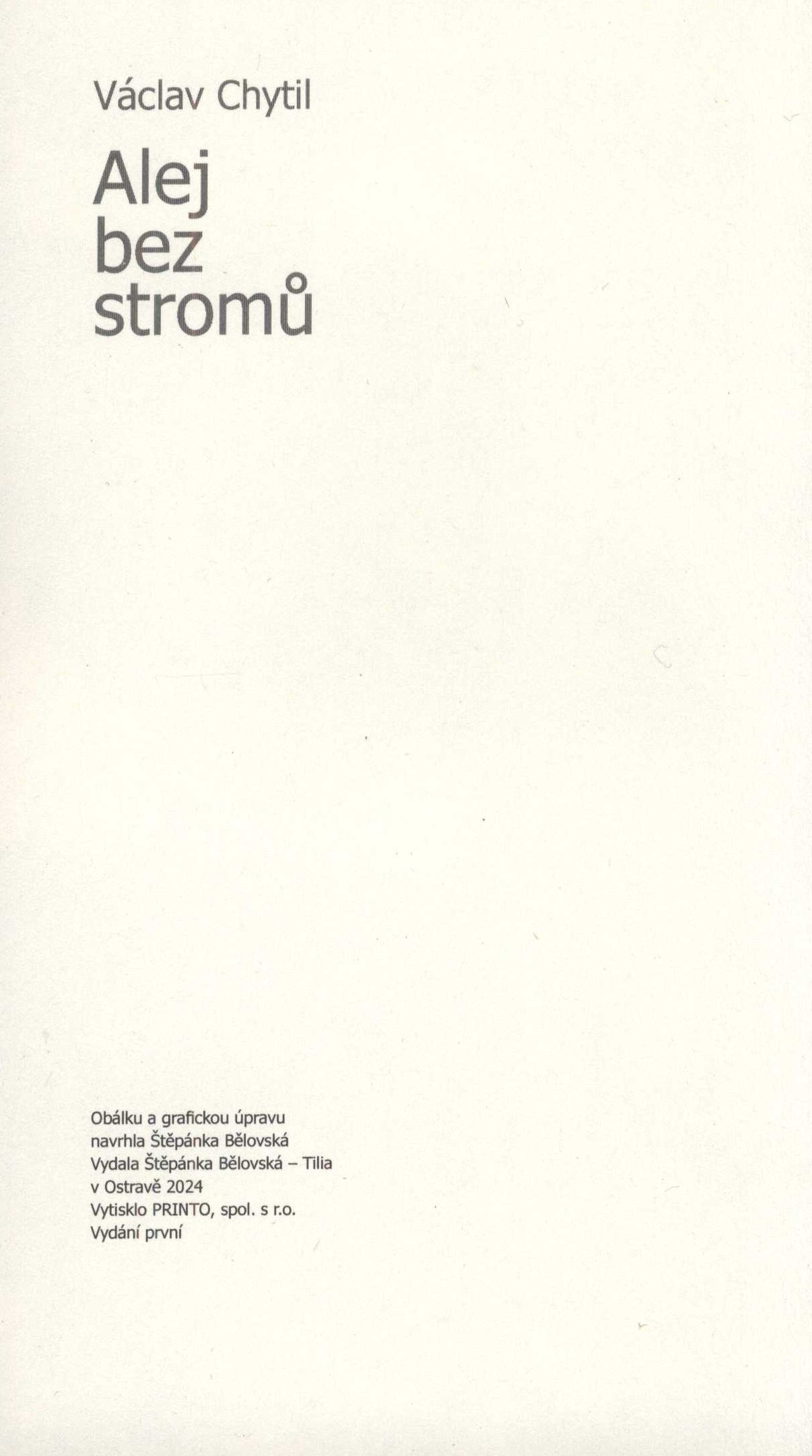Title information Alej bez stromů / Václav Chytil ; obálku a grafickou úpravu navrhla Štěpánka Bělovská Personal name Chytil, Václav, 1943-2016 (Author) Další autoři Bělovská, Štěpánka, 1972- (Bookjacket designer) (Book designer) Corporation Nakladatelství Tilia (Publisher) Printo, spol. s r. o. (tiskárna) (Printer) Edition statement Vydání první Publication Ostrava : Štěpánka Bělovská - Tilia, 2024 Manufacture Printo, spol. s r.o. Scope 195 stran ; 19 cm ISBN 978-80-86904-61-0 (brožováno) Country Czech Republic Language Czech Note Zdobená barevná obálka. - Zdobený rozložený patitul. - Frontispis. - Zdobený titulní list. - Obsah. - Na zadní straně obálky bio-bibliografická poznámka o autorovi s fotem.