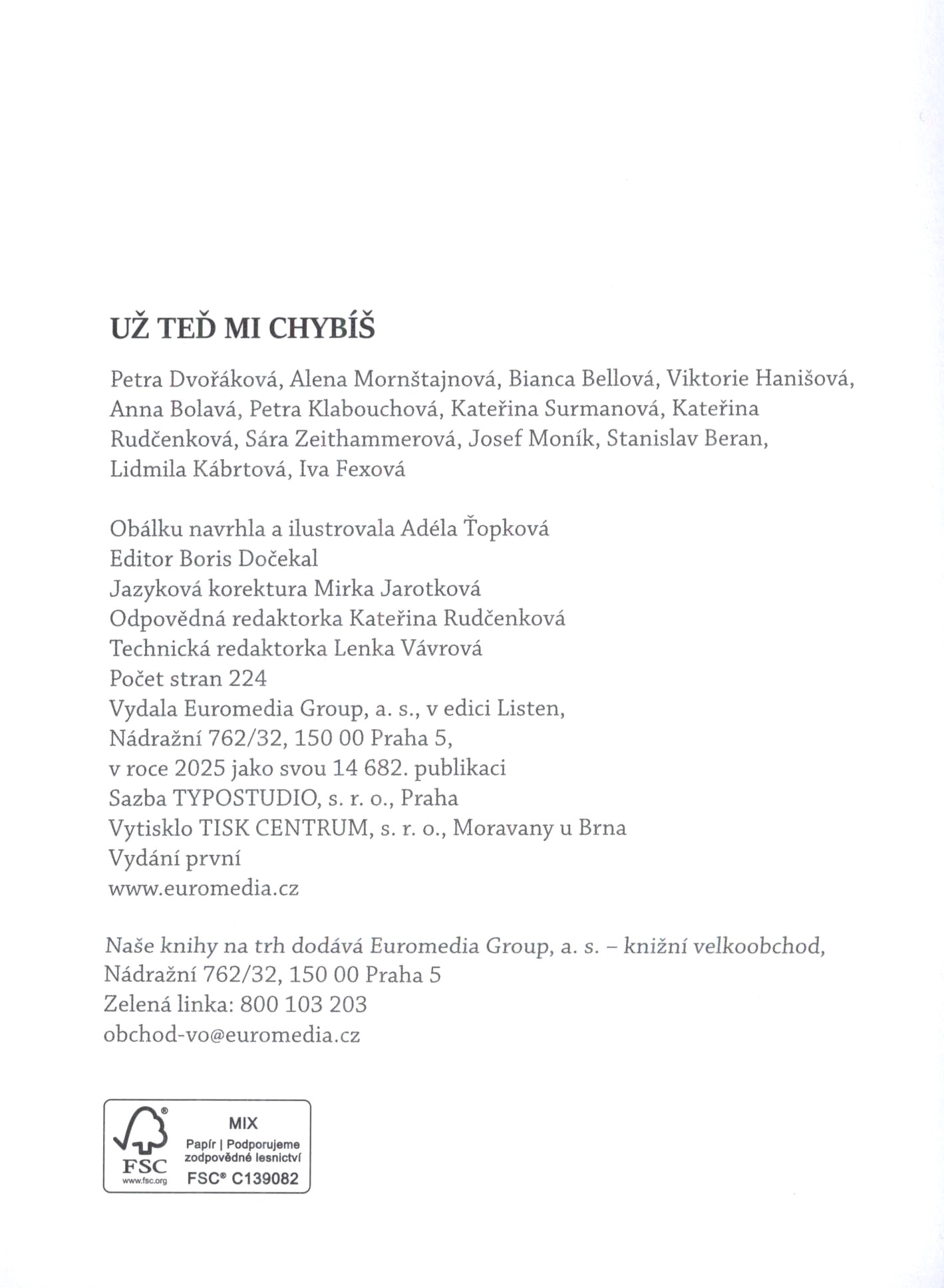Title information Už teď mi chybíš / Petra Dvořáková, Alena Mornštajnová, Bianca Bellová, Viktorie Hanišová, Anna Bolavá, Petra Klabouchová, Kateřina Surmanová, Kateřina Rudčenková, Sára Zeithammerová, Josef Moník, Stanislav Beran, Lidmila Kábrtová, Iva Fexová ; obálku navrhla a ilustrovala Adéla Ťopková Personal name Dvořáková, Petra, 1977- (Author) Další autoři Mornštajnová, Alena, 1963- (Author) Bellová, Bianca, 1970- (Author) Hanišová, Viktorie, 1980- (Author) Bolavá, Anna, 1981- (Author) Klabouchová, Petra, 1980- (Author) Surmanová, Kateřina, 1984- (Author) Rudčenková, Kateřina, 1976- (Author) Zeithammerová, Sára, 1997- (Author) Moník, Josef, 1952- (Author) Beran, Stanislav, 1977- (Author) Kábrtová, Lidmila, 1971- (Author) Fexová, Ivana, 1962- (Author) Ťopková, Adéla, 1996- (Bookjacket designer) (Illustrator) Corporation Nakladatelství Listen (Publisher) Tisk Centrum (tiskárna) (Printer) Edition statement Vydání první Publication Praha : Listen, 2025 Manufacture Moravany u Brna : Tisk Centrum, s.r.o. Scope 222 stran ; 19 cm ISBN 978-80-284-0321-8 (vázáno) Edition Česká povídka, (Nakladatelství Listen)