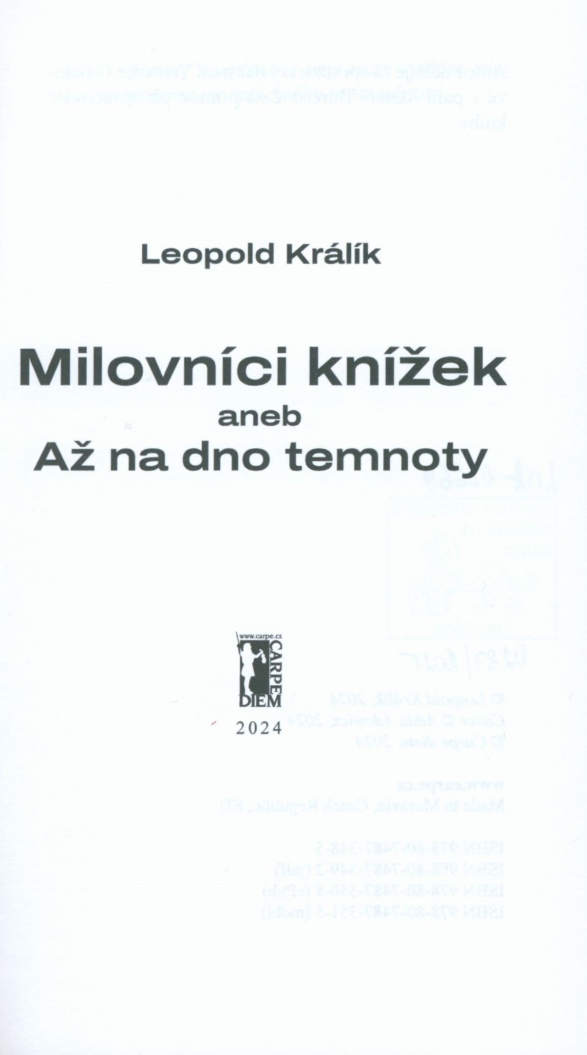 Title information Milovníci knížek, aneb, Až na dno temnoty / Leopold Králík ; obálku navrhl Adda Adowicz Personal name Králík, Leopold, 1954- (Author) Další autoři Adowicz, Adda (Bookjacket designer) Corporation Carpe diem (nakladatelství a vydavatelství) (Publisher) Tisk Kvalitně, s.r.o. (tiskárna) (Printer) Edition statement Vydání první Publication V Brumovicích : Carpe diem, 2024 Manufacture V Praze : Tisk kvalitně, s.r.o. Scope 202 stran ; 19 cm ISBN 978-80-7487-348-5 (brožováno) Country Czech Republic Language Czech Note Černá obálka s barevnou koláží, dvoubarevný text (i na hřbetu). - Na přední záložce anotace knihy, na zadní černobílé foto autora a jeho stručná biografie a bibliografie. - Poděkování. - Obsah.