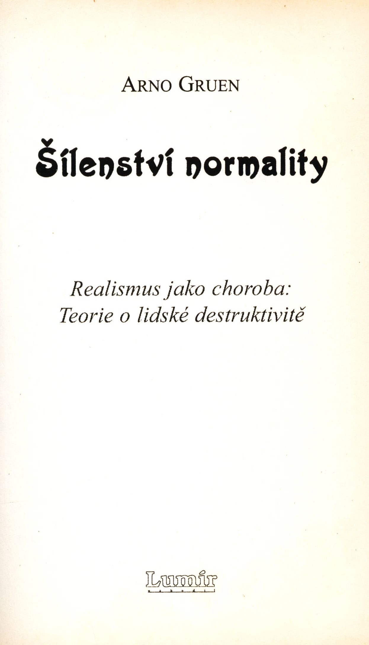 Title information Šílenství normality : realismus jako choroba: teorie o lidské destruktivitě / Arno Gruen Personal name Gruen, Arno, 1923-2015 (Author) Další autoři Lumír Nahodil (firma) (Publisher) Publication Praha : Lumír, 2001 Manufacture Ostrava : Ascher Scope 191 stran ; 19 cm ISBN 80-902970-0-5 (brožováno) Country Czech Republic Language Czech Language of the original German Note Fotografická barevná obálka. - Typografický titulní list. - Obsah. - Poznámky.