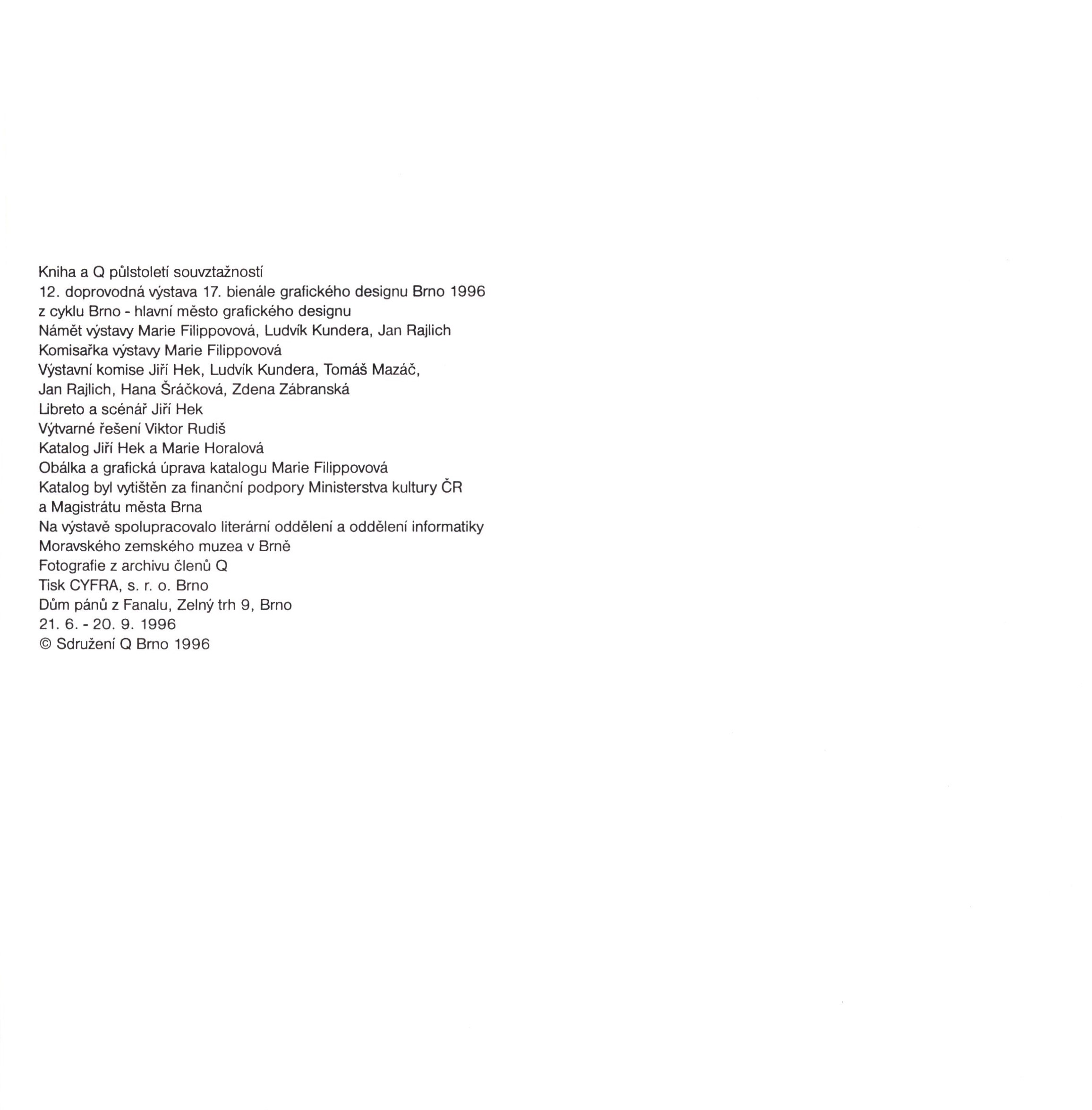 Katalog výstavy konané v domě pánů z Fanalu, Brno, Zelný trh 9, 21. června - 20. září 1996.