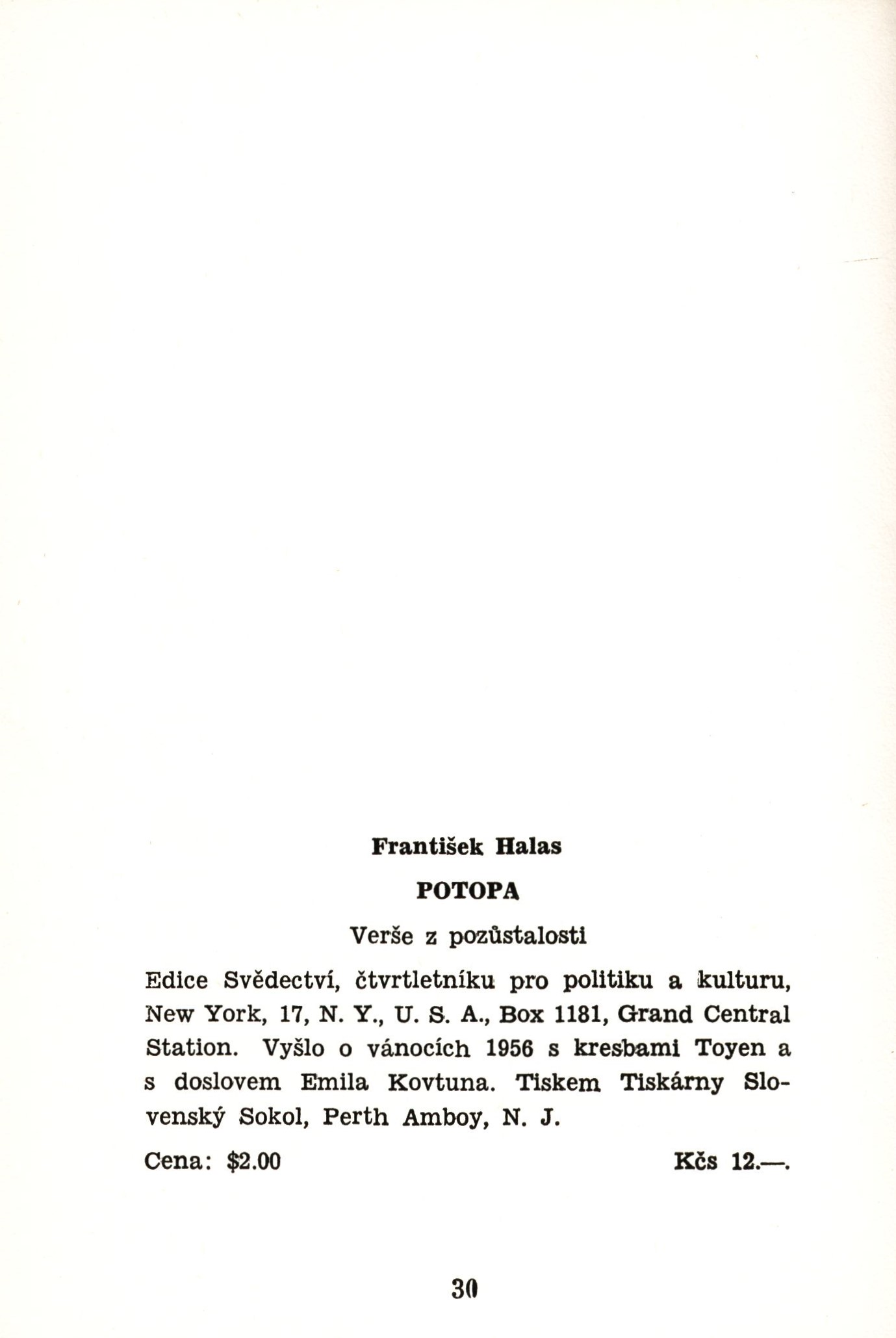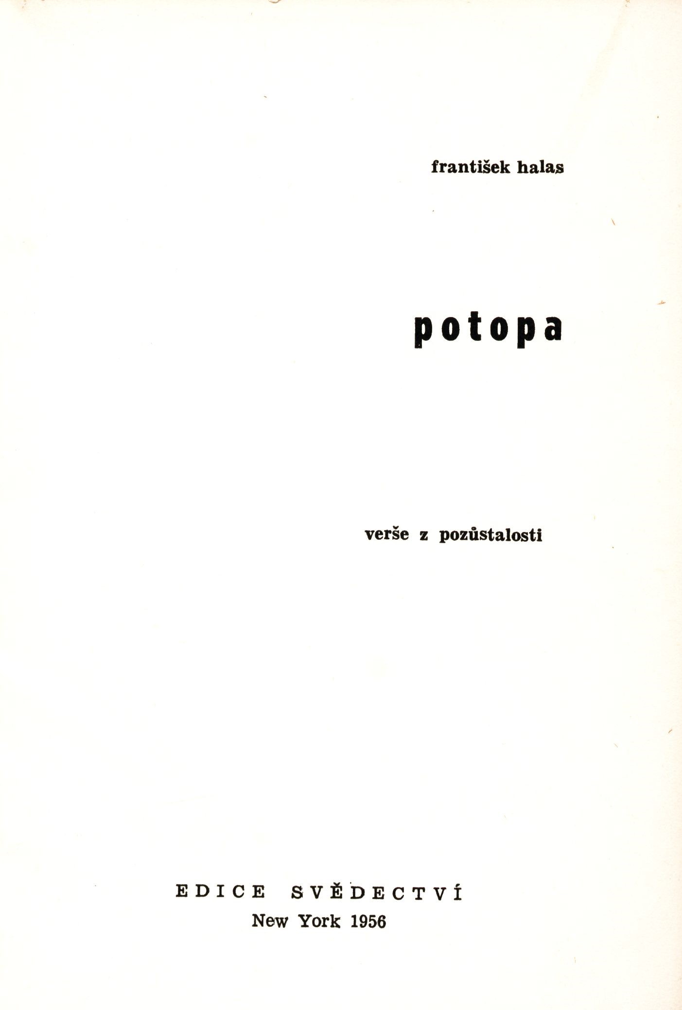 1. Title informationPotopa : Verše z pozůstalosti / František Halas ; s kresbami Toyen a doslovem Emila Kovtuna