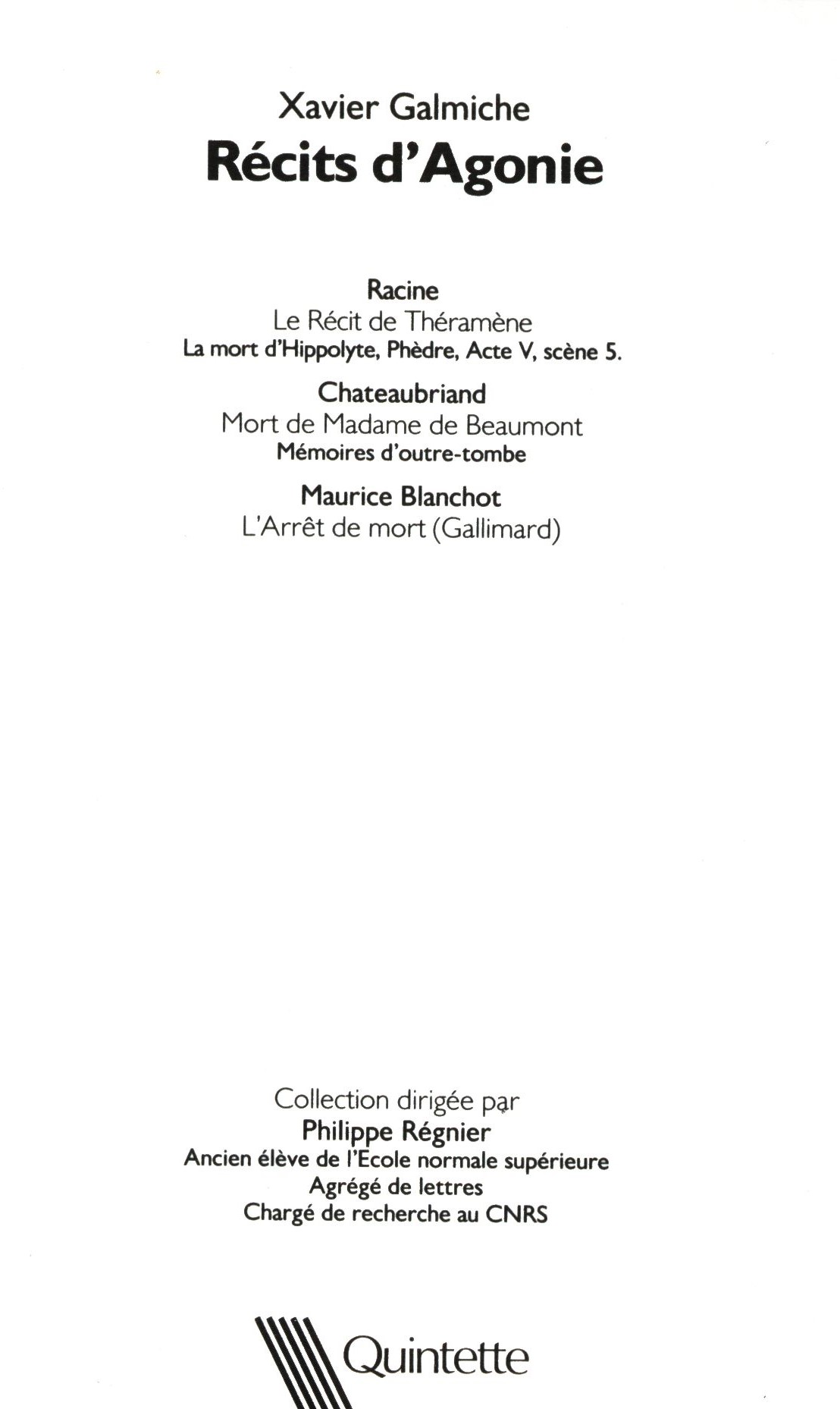 1. Title informationRécits d'agonie : Racine, Chateaubriand, Blanchot / Xavier Galmiche