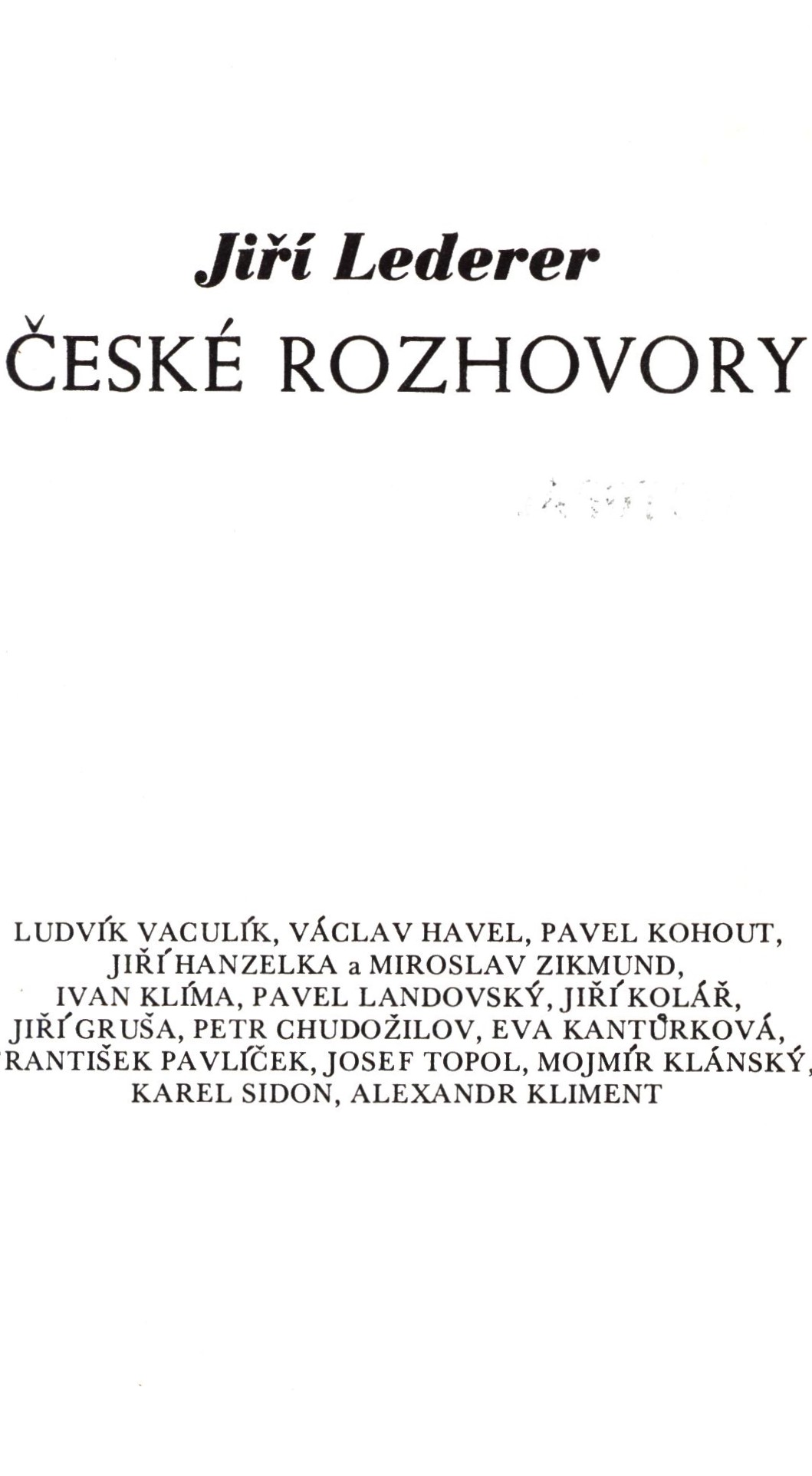 Title information České rozhovory / Jiří Lederer Personal name Lederer, Jiří, 1922-1983 (Author) (Interviewer) Další autoři Vaculík, Ludvík, 1926-2015 (Interviewee) Havel, Václav, 1936-2011 (Interviewee) Kohout, Pavel, 1928- (Interviewee) Hanzelka, Jiří, 1920-2003 (Interviewee) Zikmund, Miroslav, 1919-2021 (Interviewee) Klíma, Ivan, 1931-2025 (Interviewee) Landovský, Pavel, 1936-2014 (Interviewee) Kolář, Jiří, 1914-2002 (Interviewee) Gruša, Jiří, 1938-2011 (Interviewee) Chudožilov, Petr, 1943- (Interviewee) Kantůrková, Eva, 1930- (Interviewee) Pavlíček, František, 1923-2004 (Interviewee) Topol, Josef, 1935-2015 (Interviewee) Klánský, Mojmír, 1921-1983 (Interviewee) Sidon, Karol, 1942- (Interviewee) Kliment, Alexandr, 1929-2017 (Interviewee) Corporation Index (nakladatelství) (Publisher) Edition statement 1. vydání Publication Köln : Index, 1979 Scope 321 stran ; 17 cm ISBN (brožováno) Country Germany Language Czech Note Ilustrovaná obálka. - Faksimile podpisů autorů na frontispice. - Titulní list. - Biografická poznámka o autorovi na zadní straně obálky.