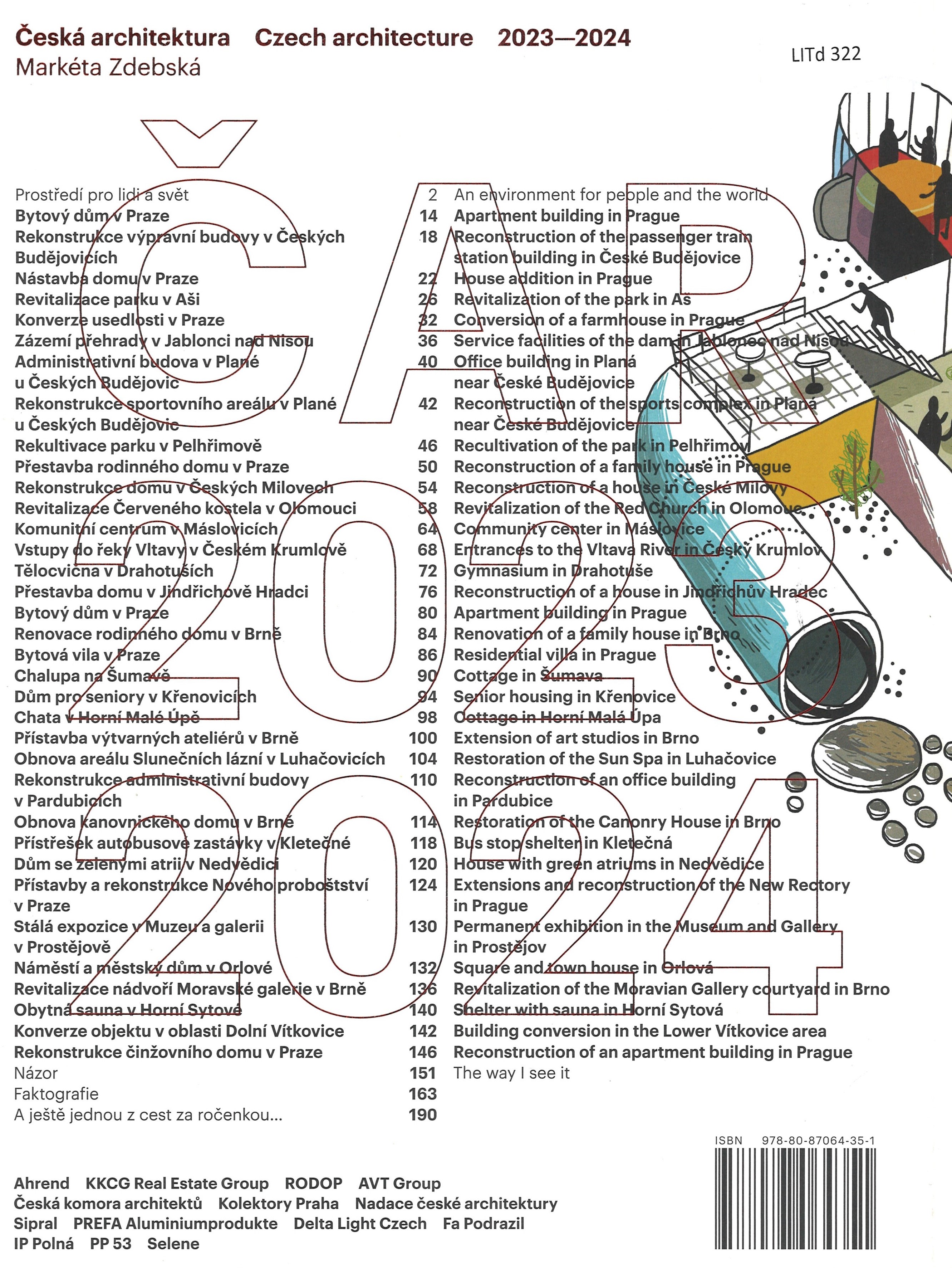 Title information Česká architektura 2023-2024 = Czech architecture / Markéta Zdebská Další autoři Žáček Zdebská, Markéta, 1977- (Commentator) Corporation Prostor - architektura, interiér, design (nakladatelství) (Publisher) Tiskárna Helbich (Printer) Publication Praha : Prostor - architektura, interiér, design, o.p.s., [2025] Manufacture Brno : Tiskárna Helbich Copyright notice date ©2025 Scope 191 stran : fotografie (převážně barevné), portréty, plány ; 31 cm Keywords česká architektura * moderní architektura * stavby * přehledy * fotografické publikace * r. 2023-2024 * ročenka Copy cnt. 1, currently available 1 Document kind monografie Call number LITd 0322