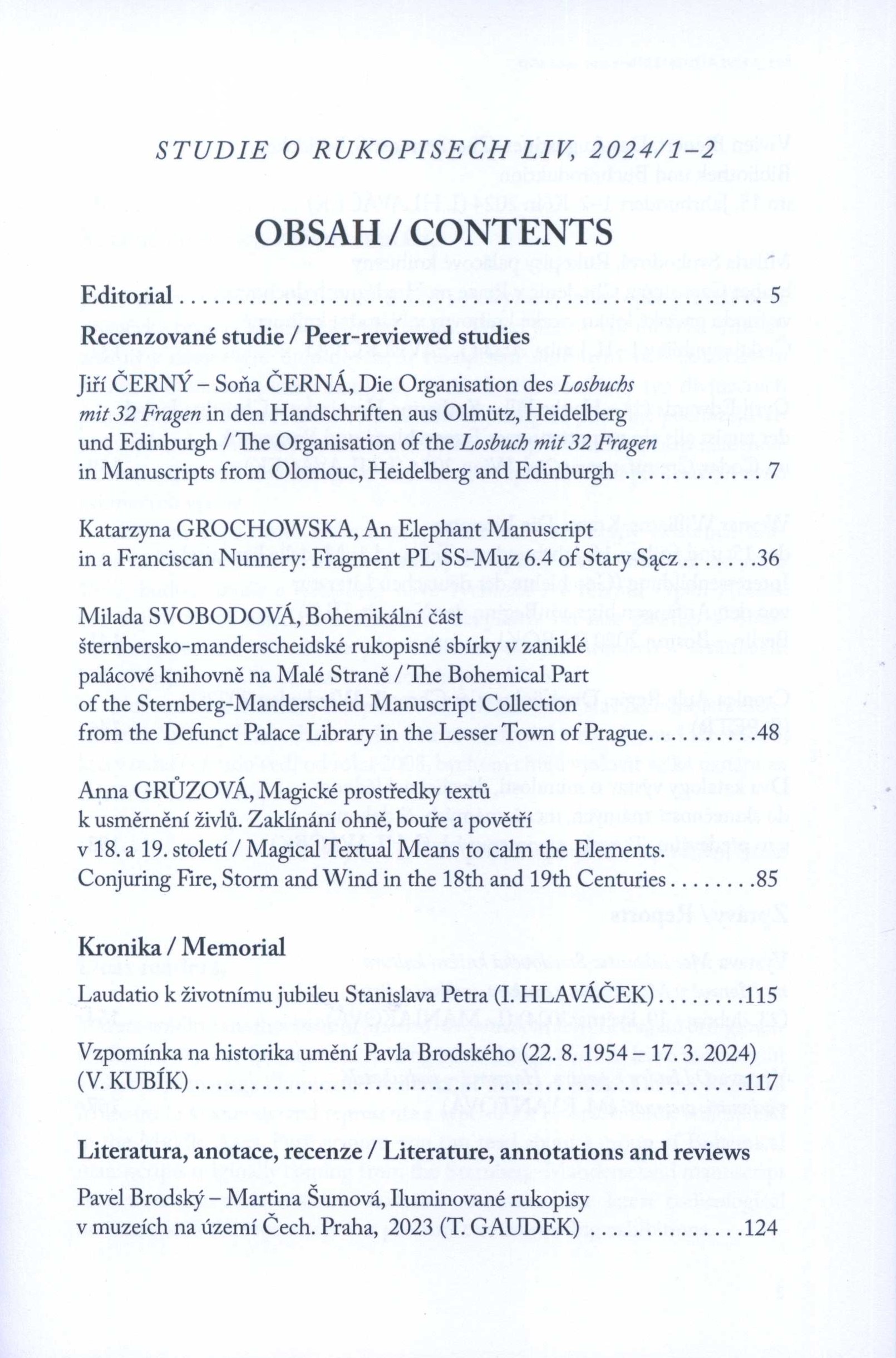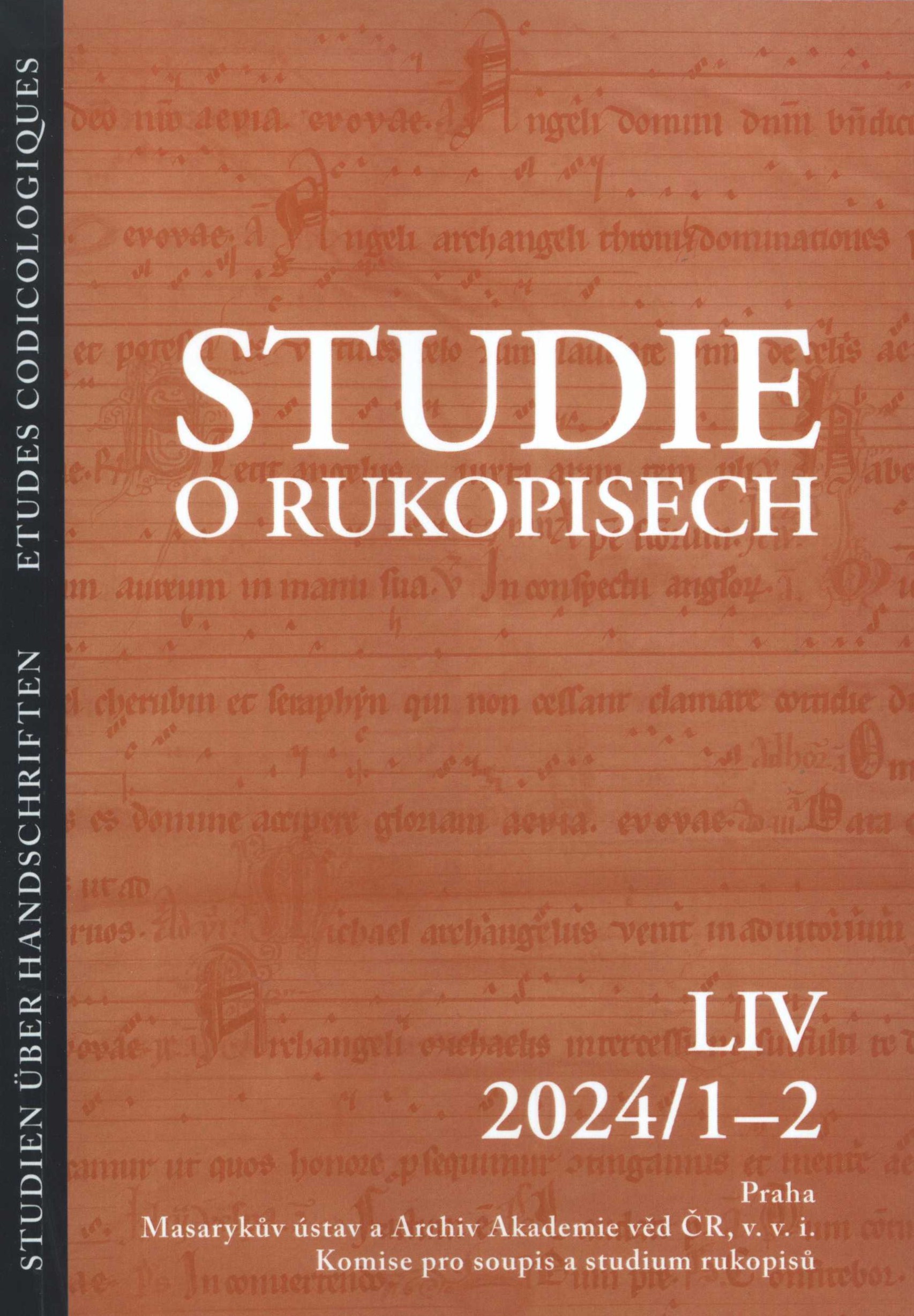 Title information Studie o rukopisech = Studien über Handschriften = Etudes codicologiques. LIV, 2024/1-2 / vedoucí redaktor Ivan Hlaváček Další autoři Hlaváček, Ivan, 1931- (Redactor) Huleš, Ondřej, 1971- (Book designer) Corporation Masarykův ústav a Archiv Akademie věd ČR (Publisher) Masarykův ústav - Archiv (Akademie věd ČR). Komise pro soupis a studium rukopisů (Publisher) Powerprint (firma) (Printer) Publication Praha : Masarykův ústav a Archiv Akademie věd ČR, v.v.i. : Komise pro soupis a studium rukopisů, 2024 Manufacture Powerprint Scope 175 stran, xii stran obrazové přílohy : ilustrace, faksimile, portréty ; 21 cm ISSN 0585-5691 Country Czech Republic Language Czech * German * English * Latin Note Černobílé faksimile a portréty v textu. - Barevné faksimile a fotografie v obrazové příloze. - Seznam autorů. - 220 výtisků.