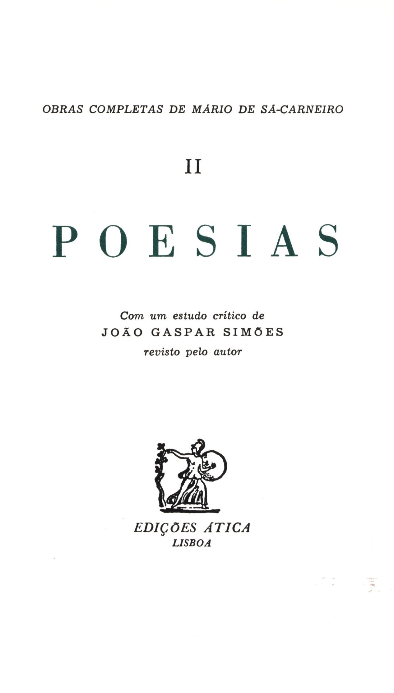 Title information Obras completas de Mário de Sá-Carneiro. 2 : Poesias / Com um estudo crítico de João Gaspar Simões Personal name Sá-Carneiro, Mário de, 1890-1916 (Author) Další autoři João Gaspar Simões 1903-1987 (Contributor) Publication Lisboa : Edições Ática, 1978 Manufacture Gráficas da Tipografia Macarlo, Lda. Scope 194 stran : fotografie, kaligramy ; 20 cm ISBN (brožováno) Edition Colecção Poesia