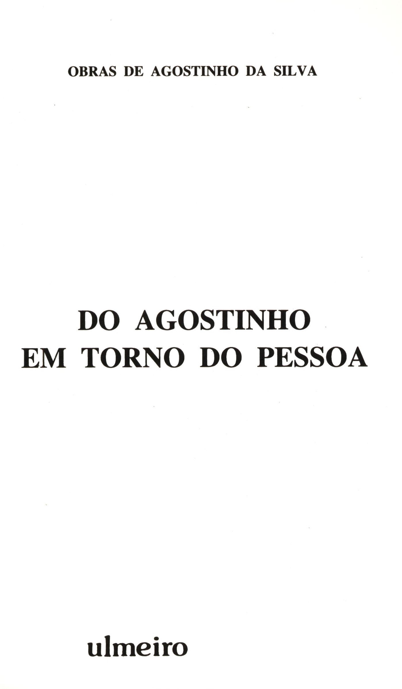 Title information Obras de Agostinho da Silva : Do Agostinho em torno do Pessoa / Agostinho da Silva Personal name Silva, Agostinho da, 1906-1994 (Author) Edition statement 1.a Edição Publication Lisboa : Ulmeiro, 1990 Scope 27 stran ; 21 cm ISBN 972-706-216-4 (brožováno) Country Portugal Language Portuguese Note Ilustrovaná obálka. - Titulní list. - Černobílá fotografie na zadní straně obálky.
