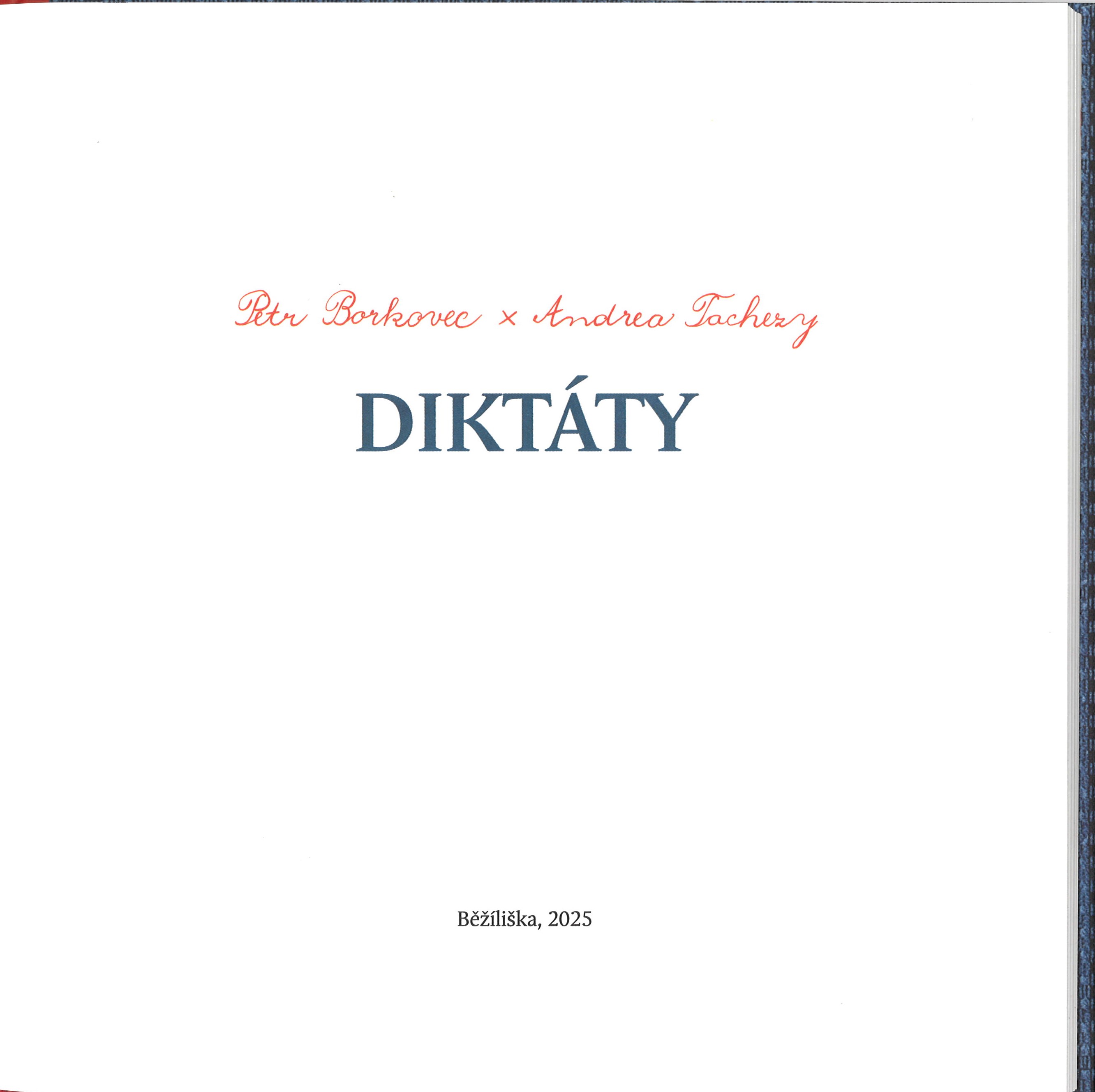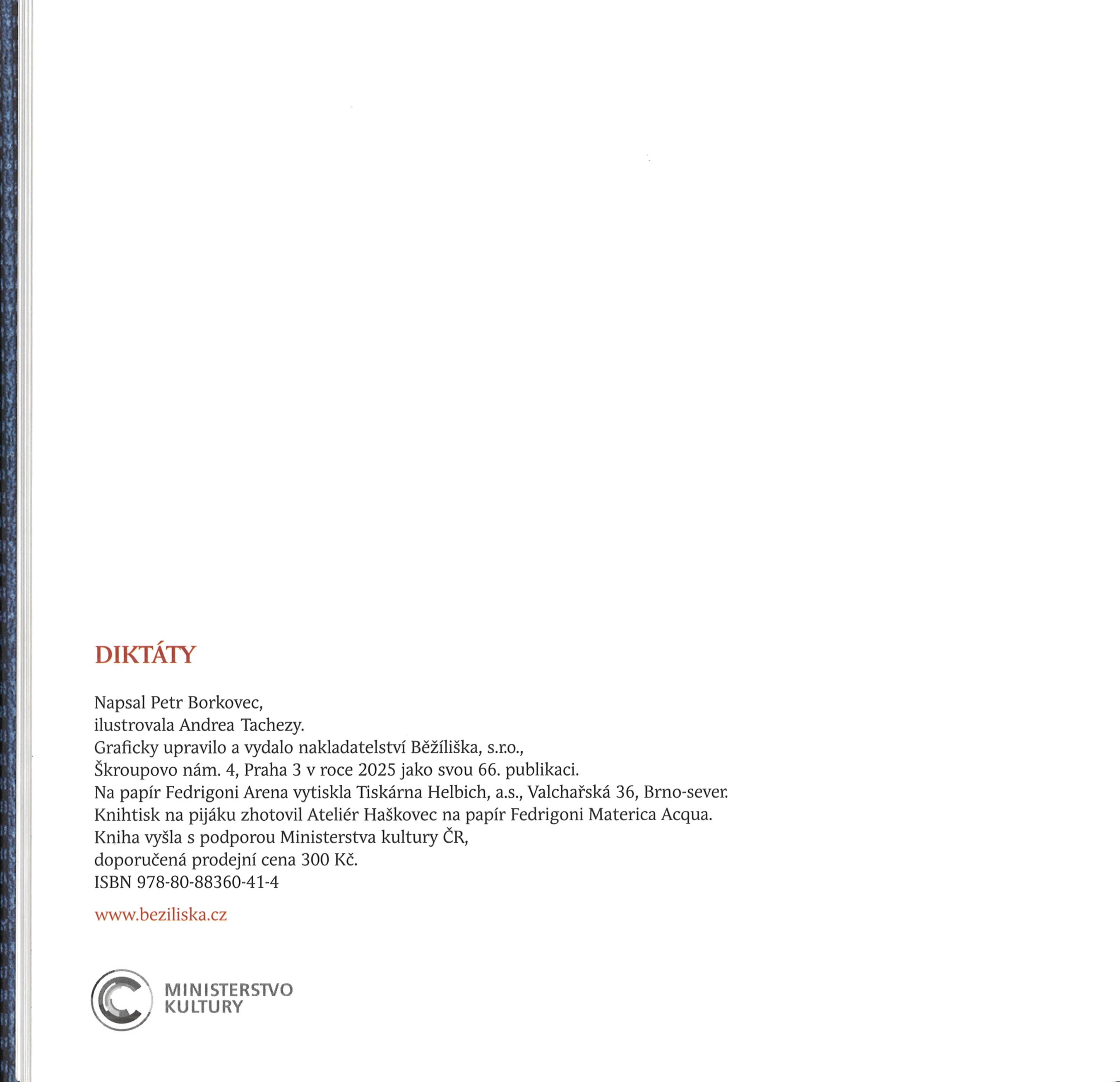 Title information Diktáty / Petr Borkovec, Andrea Tachezy Personal name Borkovec, Petr, 1970- (Author) Další autoři Tachezy, Andrea, 1966- (Illustrator) Corporation Běžíliška (nakladatelství) (Publisher) (Book designer) Tiskárna Helbich (Printer) Publication Praha : Běžíliška, 2025 Manufacture Brno : Tiskárna Helbich Scope 50 nečíslovaných stran : barevné ilustrace ; 23 cm + 1 volný list (23 x 23 cm) ISBN 978-80-88360-41-4 (vázáno) : Country Czech Republic Language Czech Note "Napsal Petr Borkovec ; ilustrovala Andrea Tachezy"--Tiráž. - Zdobená obálka. - Čtvercový rozměr knihy. - Předsádky zdobené faksimilí diktátů ve školním sešitě. - Barevně tištěný titulní list. - Liché stránky obsahují celostránkové ilustrace (asambláže). - Na vložené příloze báseň (Piják)
