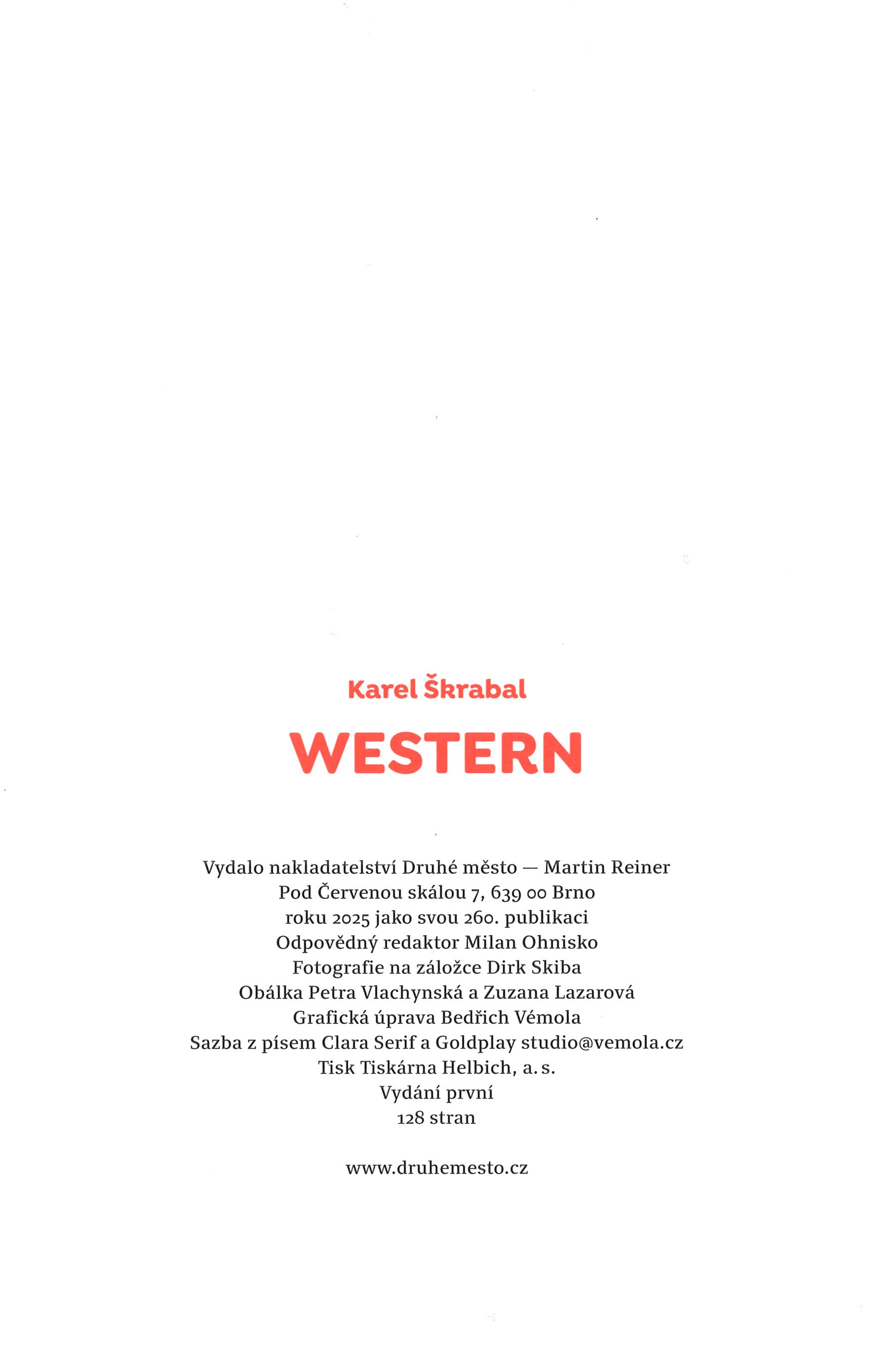 Title information Western / Karel Škrabal ; obálka Petra Vlachynská a Zuzana Lazarová ; grafická úprava Bedřich Vémola Personal name Škrabal, Karel, 1969- (Author) Další autoři Vémola, Bedřich, 1970- (Book designer) Vlachynská, Petra, 1981- (Bookjacket designer) Lazarová, Zuzana, 1986- (Bookjacket designer) Corporation Druhé město (nakladatelství) (Publisher) Tiskárna Helbich (Publisher) Edition statement Vydání první Publication Brno : Druhé město, 2025 Manufacture Tiskárna Helbich Scope 121 stran ; 24 cm ISBN 978-80-7227-914-2 (brožováno) Country Czech Republic Language Czech Note Zdobená ilustrovaná obálka. - Ilustrovaný dvoubarevně tištěný titulní list. - Na záložkách obálky anotace a informace o autorovi s fotem