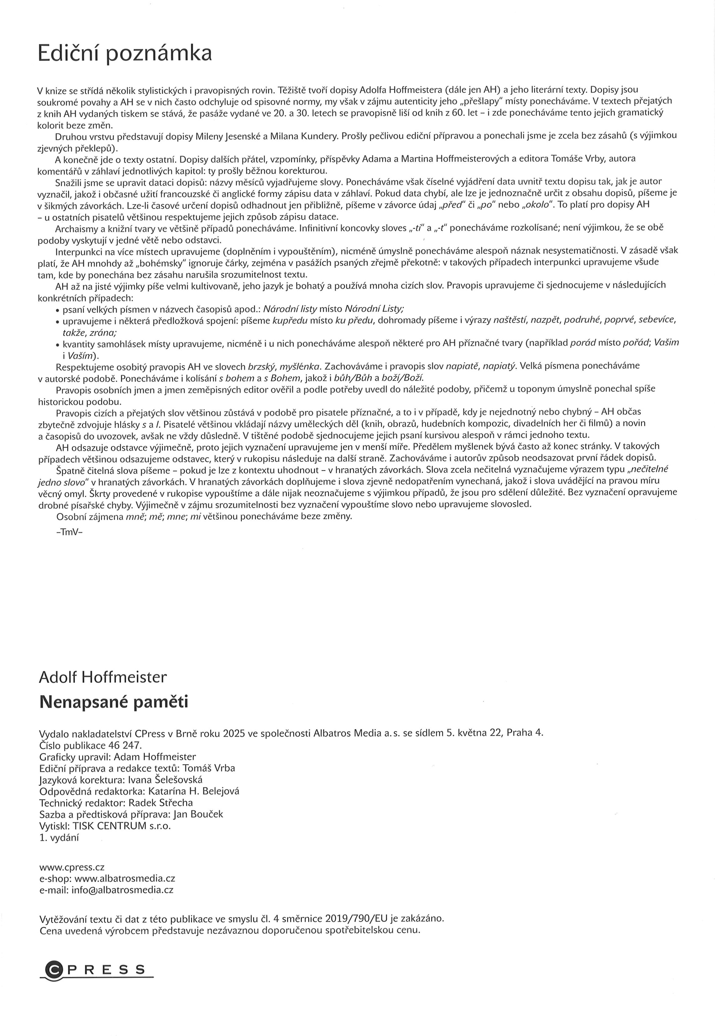 Title information Adolf Hoffmeister : nenapsané paměti / Adam Hoffmeister, Martin Hoffmeister, Tomáš Vrba Personal name Hoffmeister, Adolf, 1902-1973 (Author) Další autoři Hoffmeister, Adam, 1953- (Author) Hoffmeister, Martin, 1947- (Author) Vrba, Tomáš, 1947- (Author) Corporation CPress (nakladatelství) (Publisher) Tisk Centrum (tiskárna) (Printer) Edition statement 1. vydání Publication Brno : CPress, 2025 Manufacture Moravany u Brna : Tisk Centrum s.r.o. Scope 327 stran : ilustrace, portréty, faksimile ; 31 cm ISBN 978-80-264-5755-8 (vázáno) Country Czech Republic Language Czech Note Obsahuje rejstřík. - Zdobená kartonová vazba bez přebalu s fotoportrétem A. Hoffmeistra. - Zdobený barevně tištěný titulní list. - Barevné i černobílé fotografie, faksimile, reprodukce obrazů. - Korespondence. - Ediční poznámka