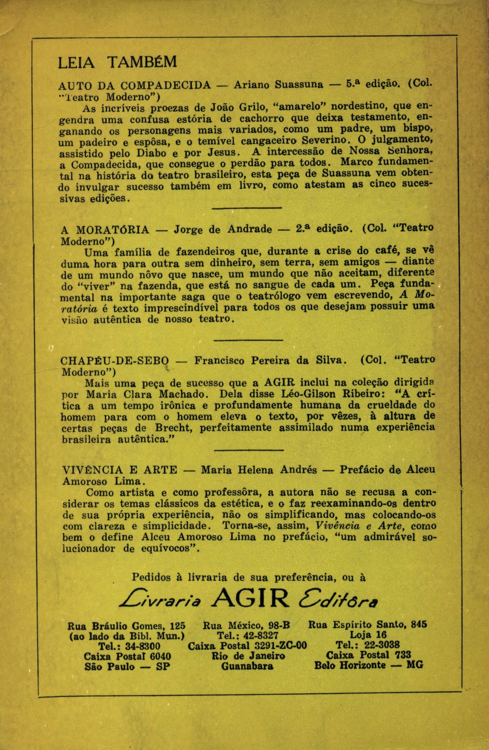 Title information A Menina e o Vento, Maroquinhas Fru-Fru, Maria Minhoca, A Gata Borralheira / Maria Clara Machado ; Capa de José Rios Personal name Machado, Maria Clara, 1921-2001 (Author) Další autoři Rios, José (Bookjacket designer) Corporation Livraria Agir Editôra (Publisher) Borsoi s / a. Indústria e comércio (Printer) Edition statement 2.a edição Publication Rio de Janeiro : Livraria Agir Editôra , 1969 Scope 170 stran : čb. fotografie 22 cm ; ISBN (Vázáno) Country Brazil Language Portuguese Note Ilustrovaná obálka. - Typografický titulní list. - Obsah. - Čb. fotografie. - Na přední a zadní záložce zhodnocení autorčiny tvorby Yanem Michalskim. - Na zadní straně obálky soupis některých dalších knih vydaných ve stejném vydavatelství jako autorčina kniha.