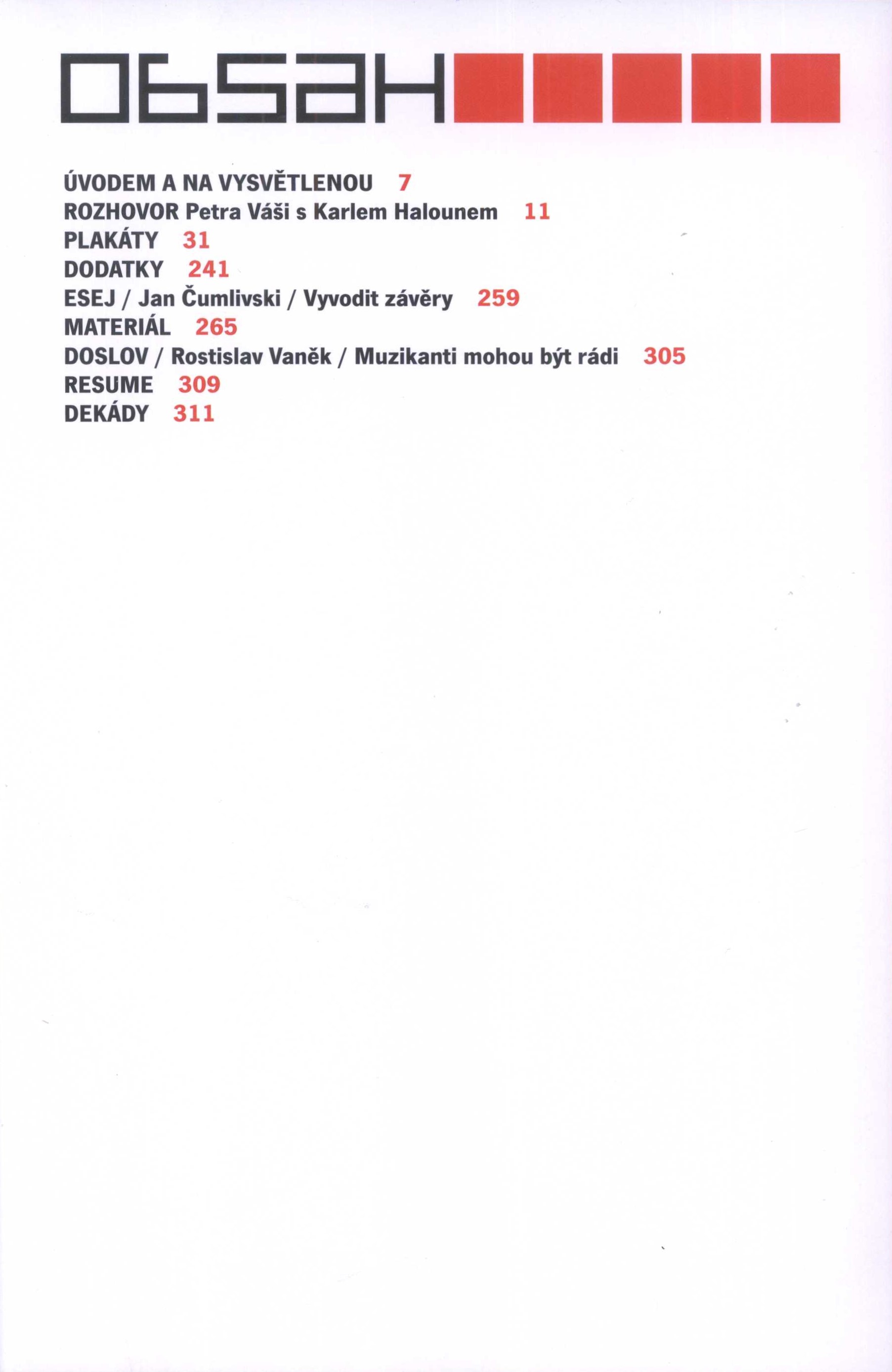 Note Barevná zdobená obálka. - Na záložkách obálky biobibliografické poznámky o auterech plakátů a krátký text K. Halouna. - Převážně barevné fotografie, portréty a faksimile. - Anglické resumé. - Na zadní straně obálky upoutávka na knihu. - "Kniha obsahuje rozhovor s Petrem Vášou Ze zvědavosti a pro zábavu, 354 autorem komentovaných plakátů, esej Jana Čumlivského Vyvodit závěry (Tzv. místo doslovu) ... doslov Rostislava Vaňka Muzikanti mohou být rádi ..."