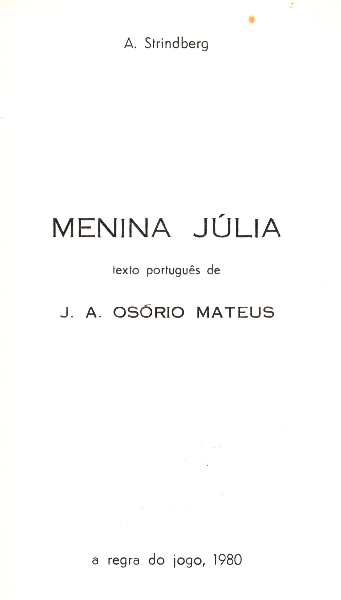 Title information Menina Júlia / A. Strindberg ; texto português de J. A. Osório Mateus Personal name Strindberg, August, 1849-1912 (Author) Další autoři Osório Mateus, J. A. (Translator) Corporation A Regra do Jogo (Publisher) Tip. Garcia & Carvalho, Lda. (Printer) Publication Lisabon : A Regra do Jogo, 1980 Manufacture Tip. Garcia & Carvalho, Lda., Scope 66 stran : ilustrace na přední a zadní obálce knihy; 19 cm ISBN (Vázáno) Country Portugal Language Portuguese Language of the original Swedish Note Zdobená obálka. - Typografický titulní list. - Autorova předmluva. - Poznámka překladatele. - Obsah.