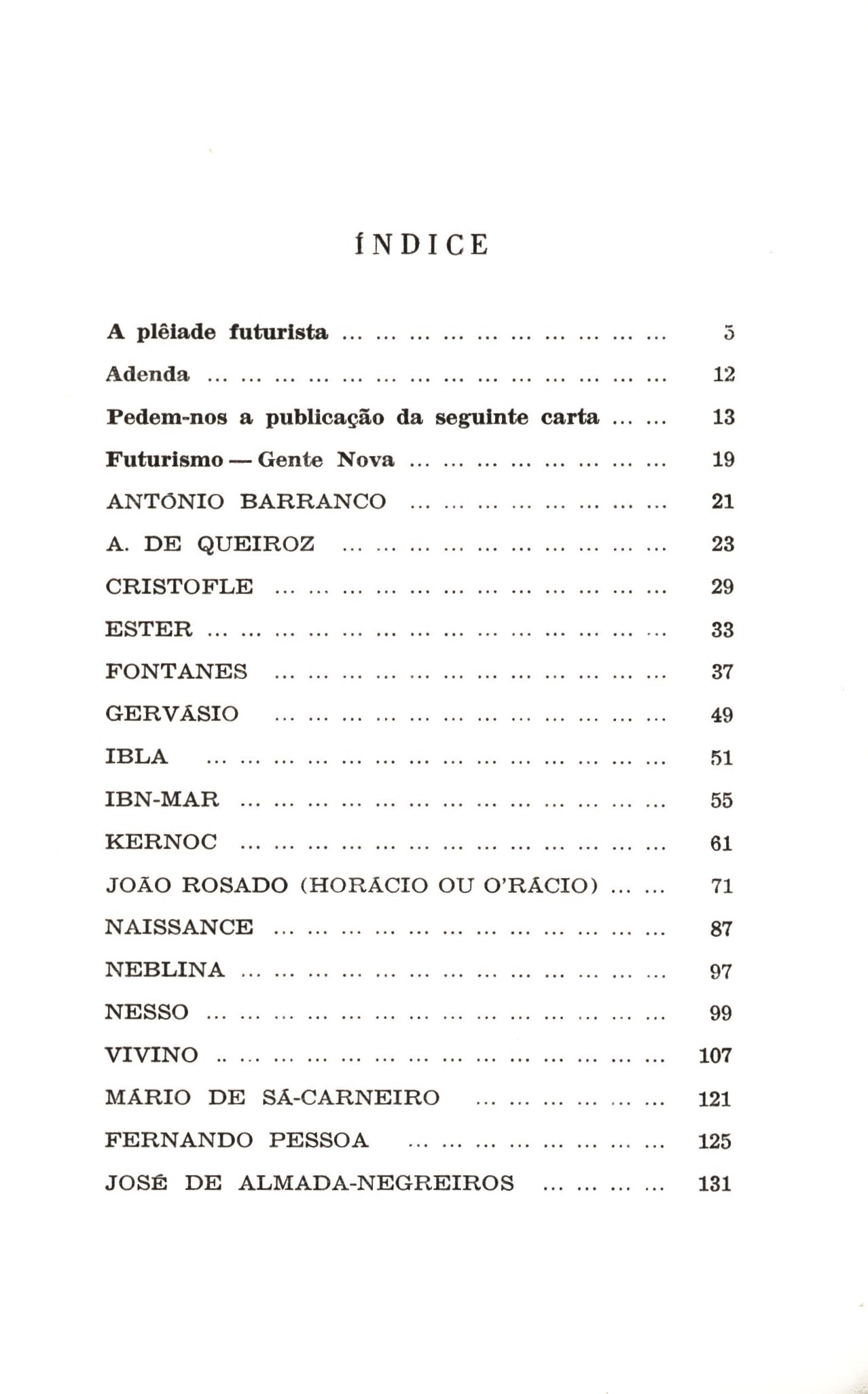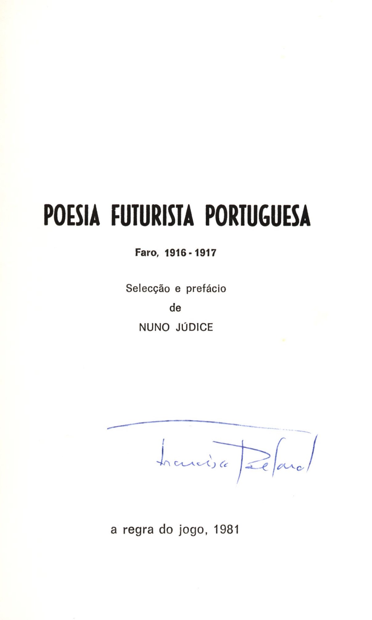 Title information Poesia futurista portuguesa : Faro, 1916–1917 / Selecção e prefácio de Nuno Júdice Personal name Júdice, Nuno, 1949-2024 (Compiler) (Author of introduction) Další autoři A Regra do Jogo (Publisher) Tipografia DUARTE (Printer) Publication Lisabon : A Regra do Jogo, 1981 Manufacture Tipografia DUARTE Scope 135 stran: reprodukce, čb. fotografie ; 18 cm ISBN (Brožováno) Country Portugal Language Portuguese Note Zdobená obálka. - Typografický titulní list. - Předmluva. - Obsah.