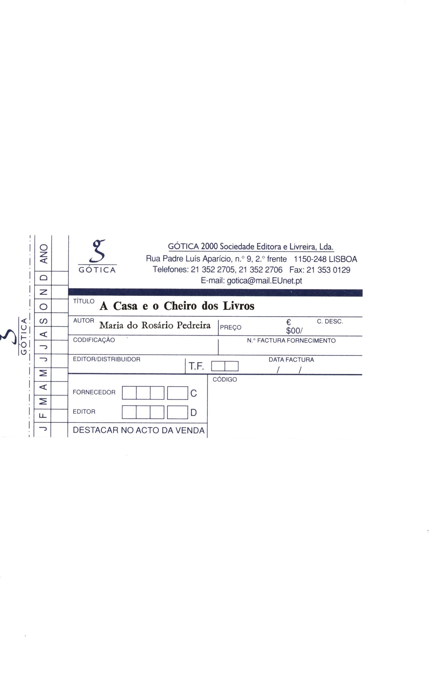 Title information A Casa e o Cheiro dos Livros / Maria do Rosário Pedreira Personal name do Rosário Pedreira, Maria (Author) Další autoři Gótica (firma) (Publisher) Tipografia Guerra (Printer) Publication Lisabon : Gótica, 2002 Manufacture Viseu : Tipografia Guerra, Scope 74 stran: barevná fotografie ; 21 cm ISBN 972-792-044-6 (brožováno) Country Portugal Language Portuguese Note Zdobená obálka. - Na přední záložce autorčina fotografie a informace o autorce. - Typografický titulní list. - Obsah.