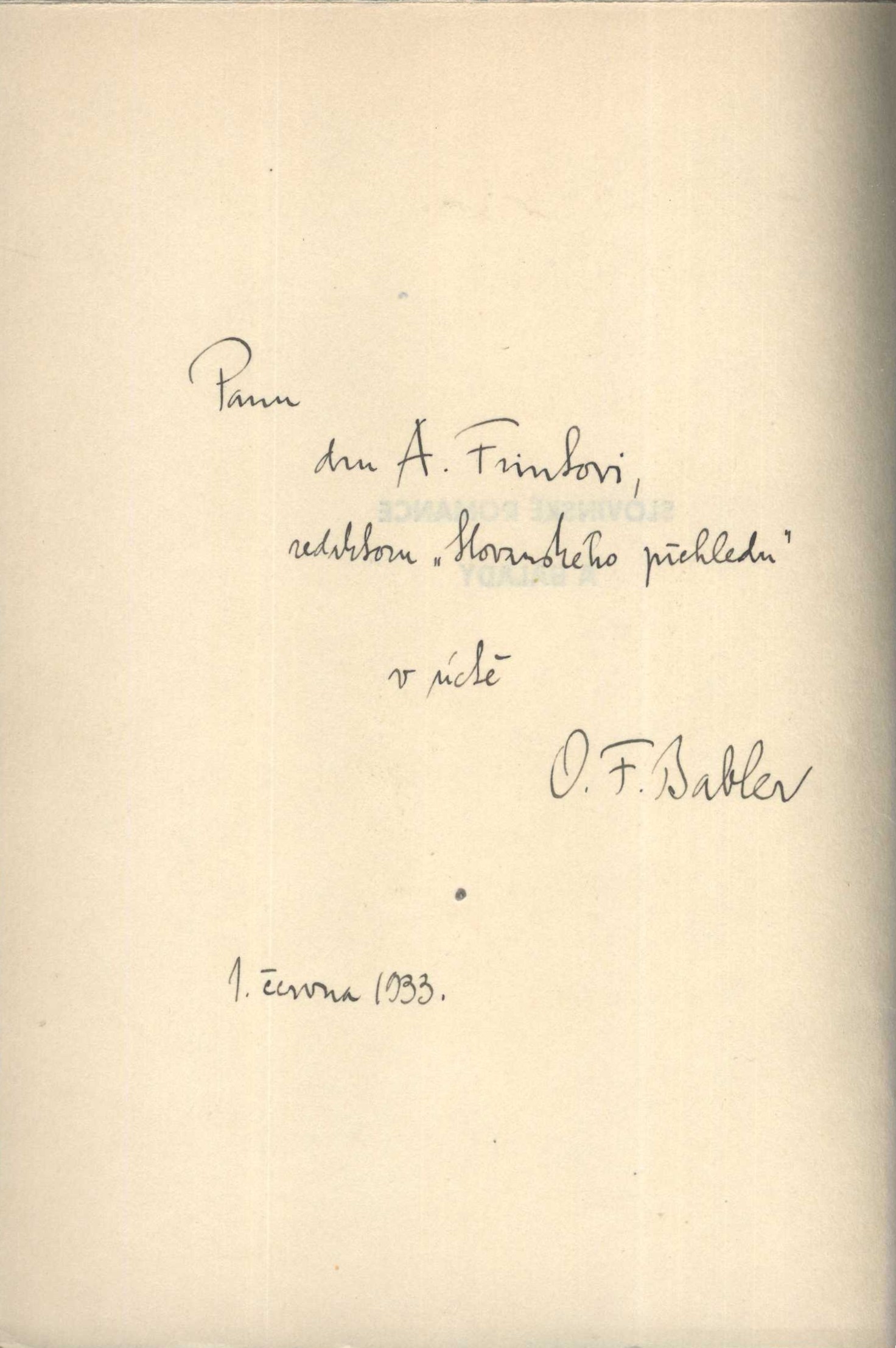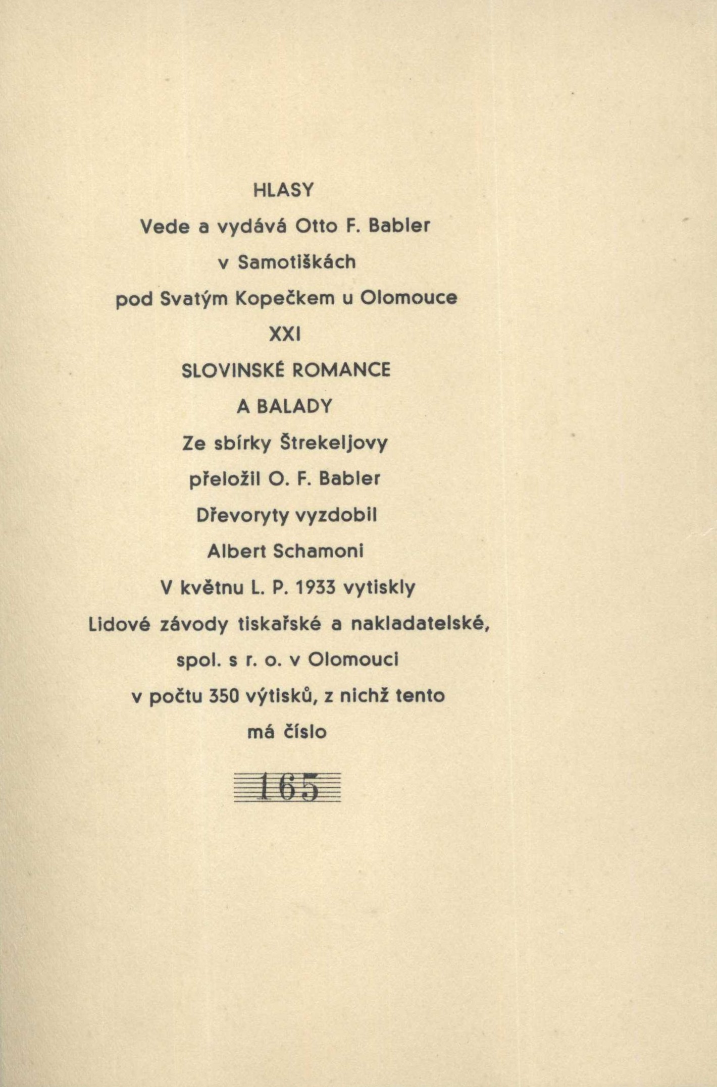 Title information Slovinské romance a balady / ze sbírky Štrekeljovy přeložil O.F. Babler ; dřevoryty vyzdobil Albert Schamoni Další autoři Štrekelj, Karel, 1859-1912 (Bibliographic antecedent) (Compiler) Babler, Otto František, 1901-1984 (Translator) (Publisher) Schamoni, Albert, 1906-1945 (Illustrator) Corporation Lidové závody tiskařské a nakladatelské (Olomouc) (Printer) Publication Samotišky, Otto F. Babler, 1933 Manufacture V Olomouci : Lidové závody tiskařské a nakladatelské, spol. s r. o. Scope 56 stran : ilustrace ; 19 cm Edition Hlasy ; XXI