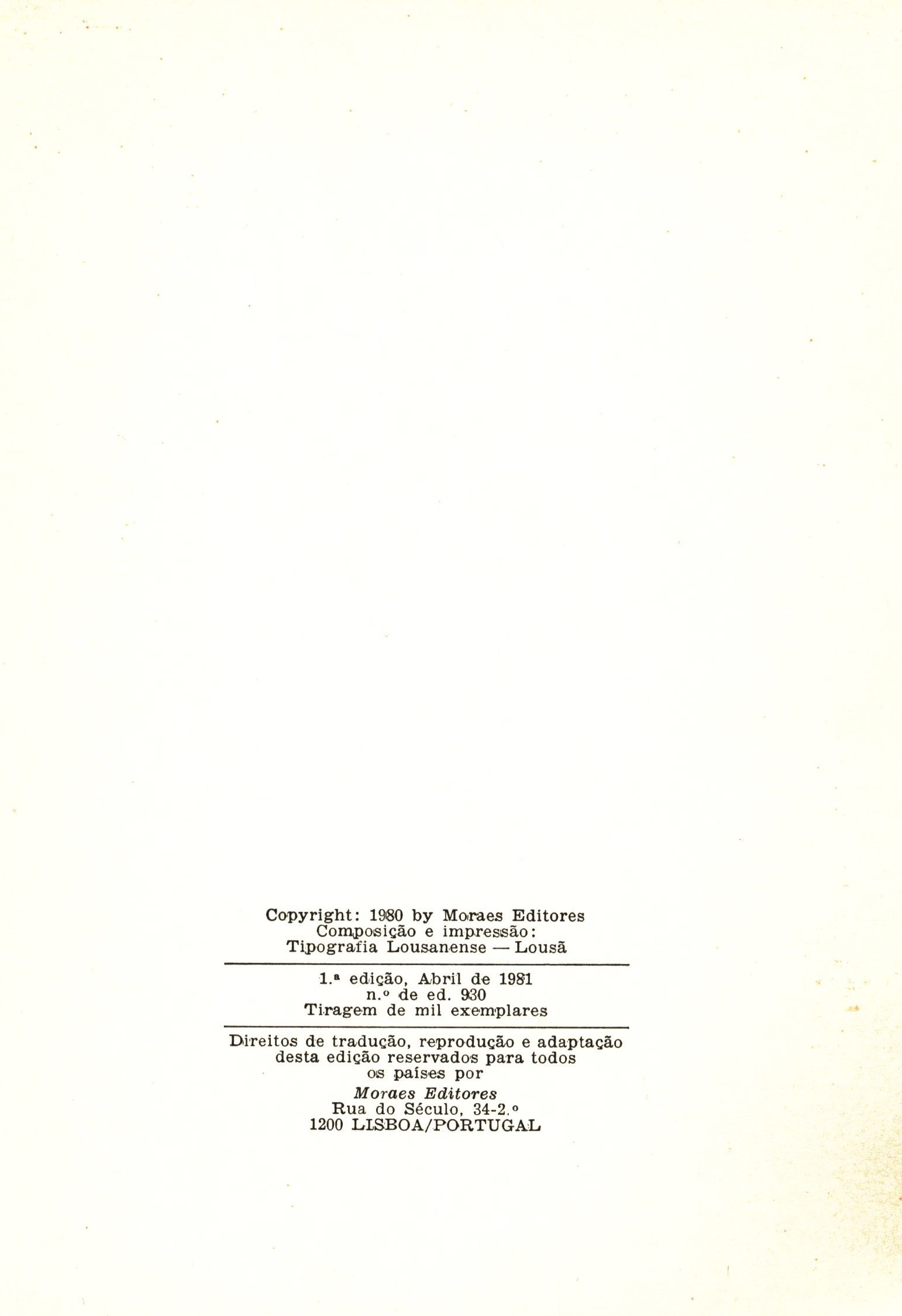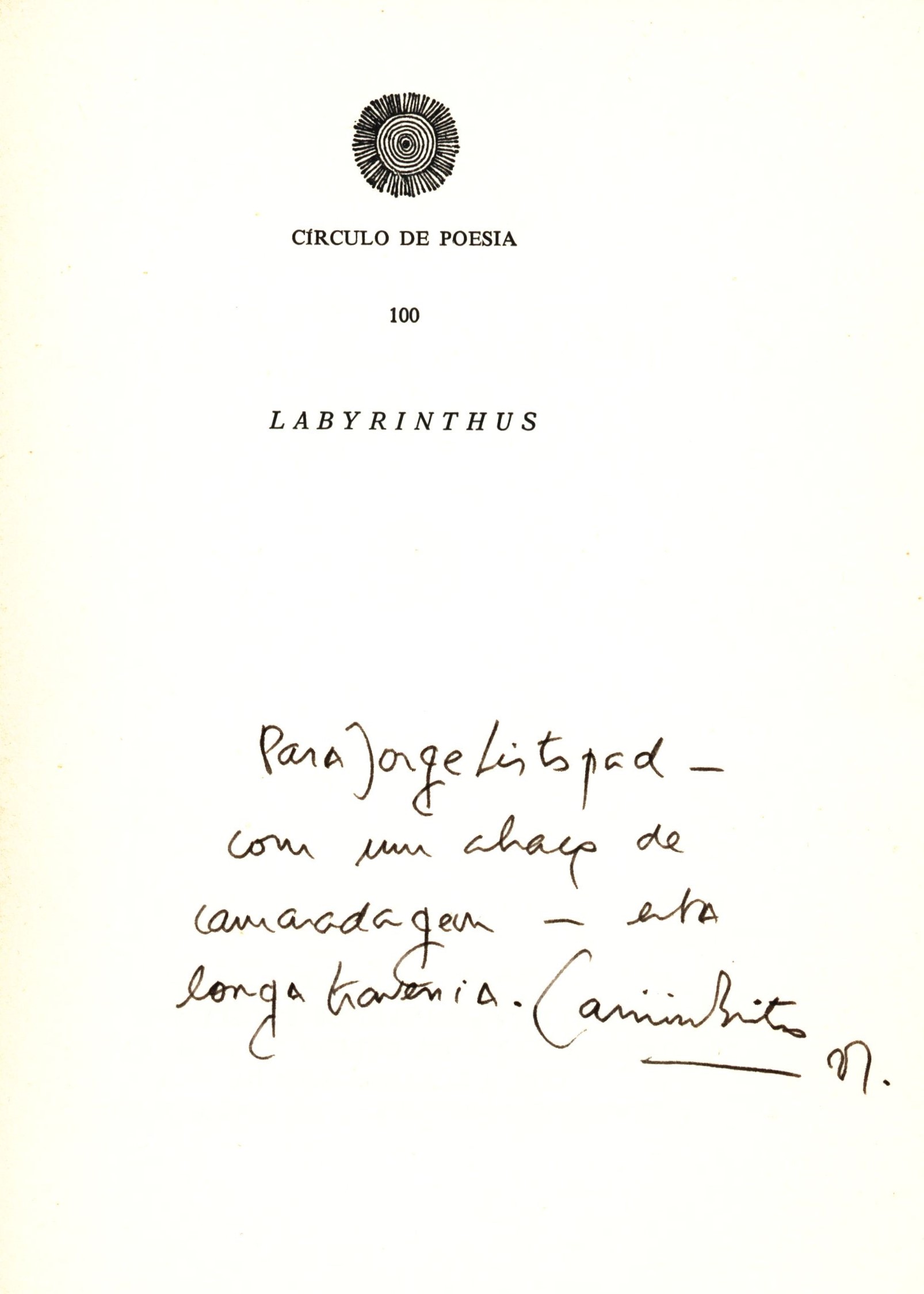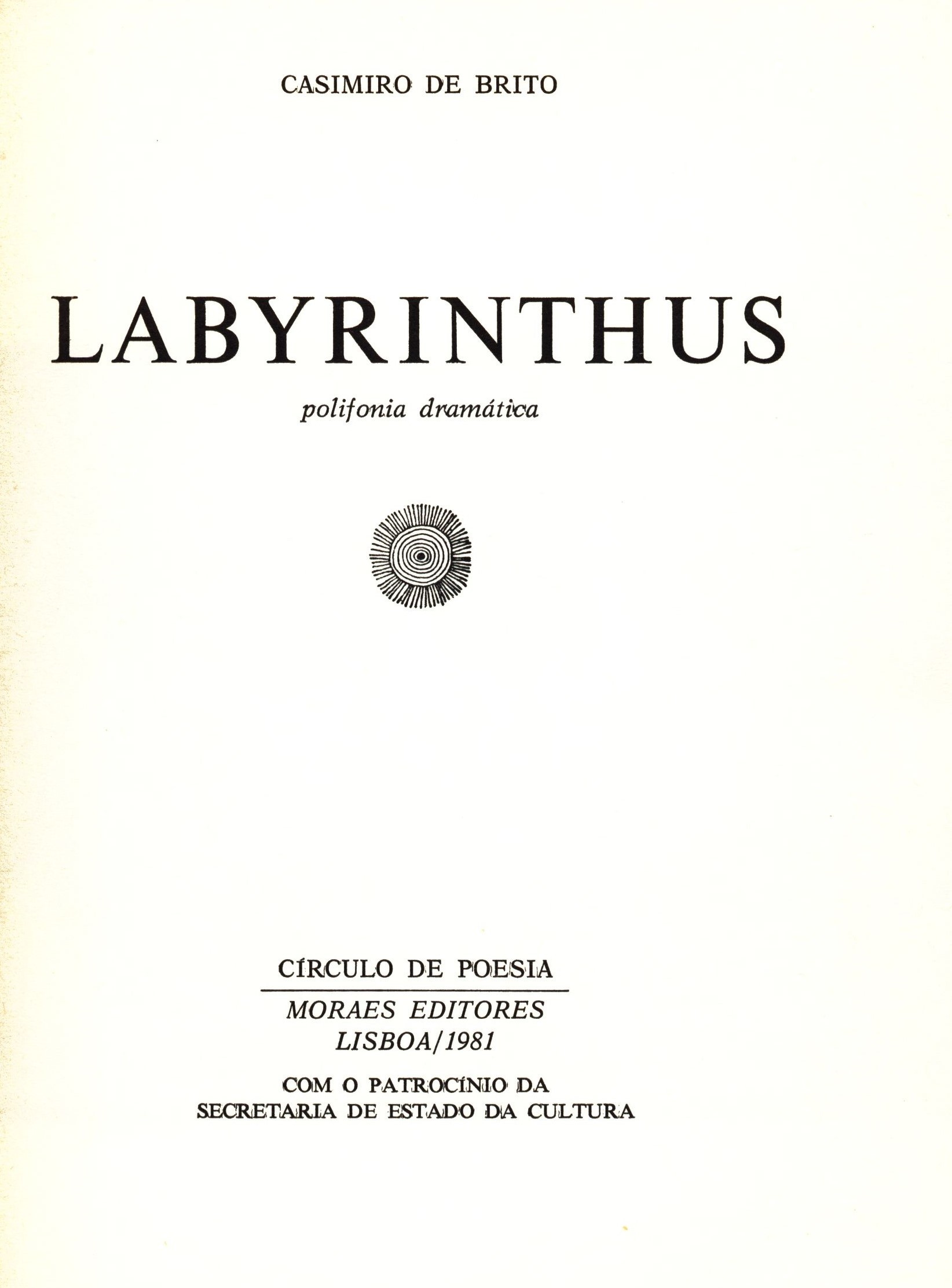 Title information Labyrinthus : polifonia dramática / Casimiro de Brito Personal name Brito, Casimiro de, 1938-2024 (Author) Další autoři Moraes Editores (Publisher) Tipografia Lousanense (Printer) Edition statement 1.a edição Publication Lisboa : Moraes Editores, 1981 Manufacture Lousã : Tipografia Lousanense Scope 143 stran : čb. ilustrace ; 20 cm ISBN (Brožováno) Edition Círculo de poesia ; 100