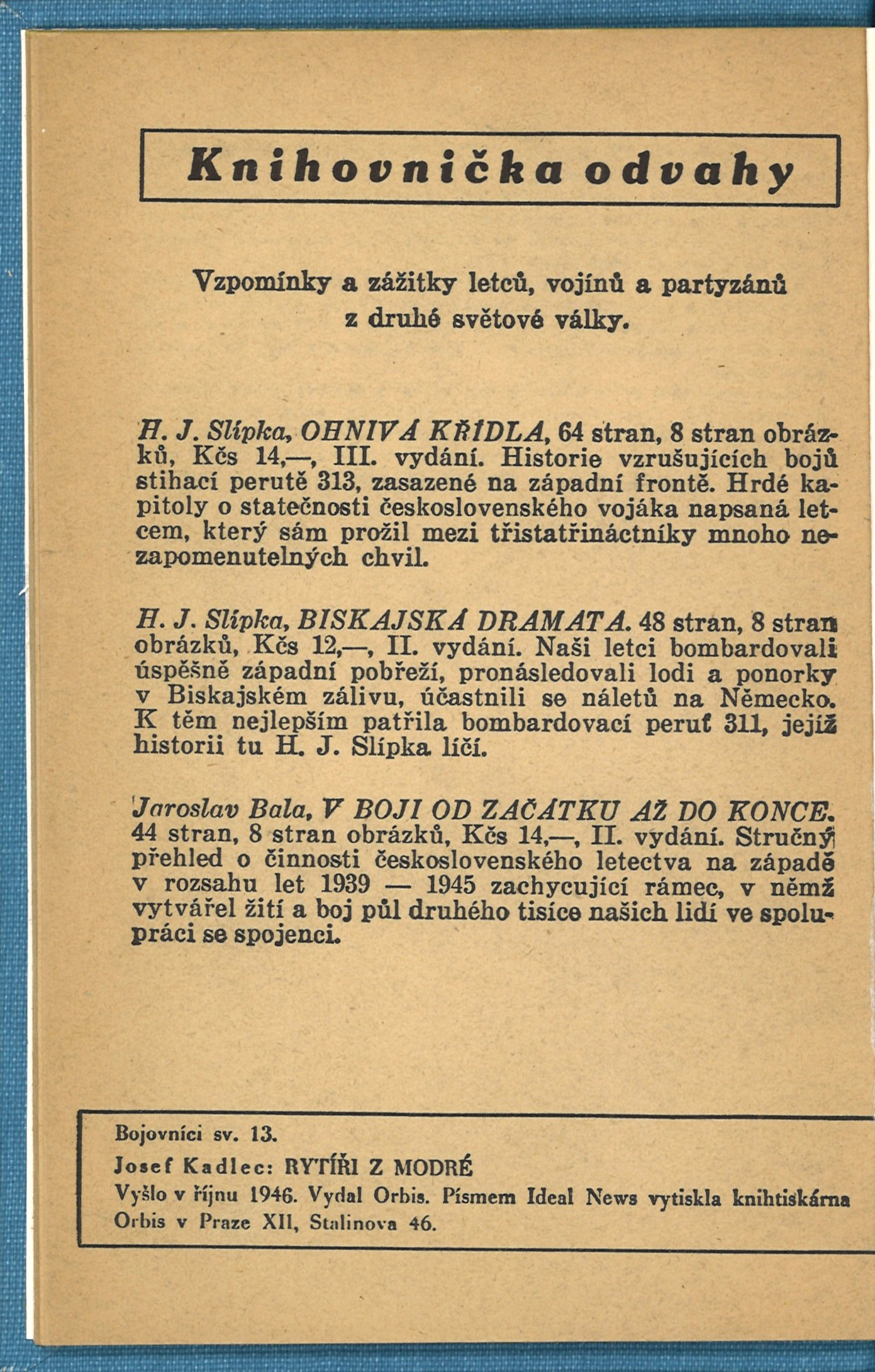 Knihovnička odvahy, (Orbis) Bojovníci (Orbis)Country Czech Republic Language Czech Note Zdobená ilustrovaná obálka. - Na rubu obálky nekrolog věnovaný právě zesnulému sovětskému prezidentovi. - Na zadní straně obálky tiráž a ediční nabídka