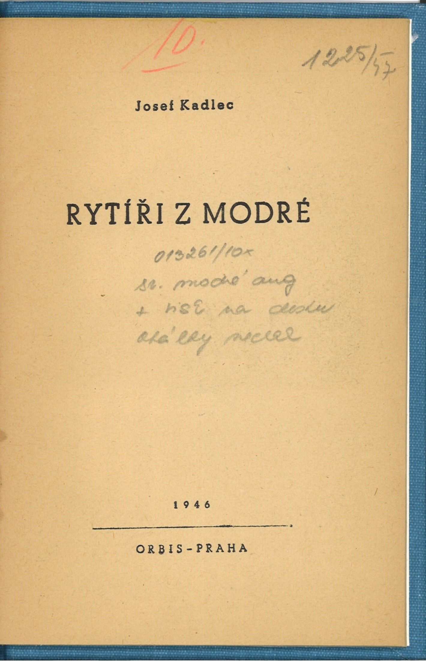 Title information Rytíři z Modré / Josef Kadlec Personal name Kadlec, Josef, 1912-2000 (Author) Další autoři Orbis (nakladatelství a vydavatelství) (Publisher) Orbis (tiskárna) (Printer) Publication Praha : Orbis, 1946 Scope 30 stran ; 19 cm ISBN (Vázáno) Edition Knihovnička odvahy