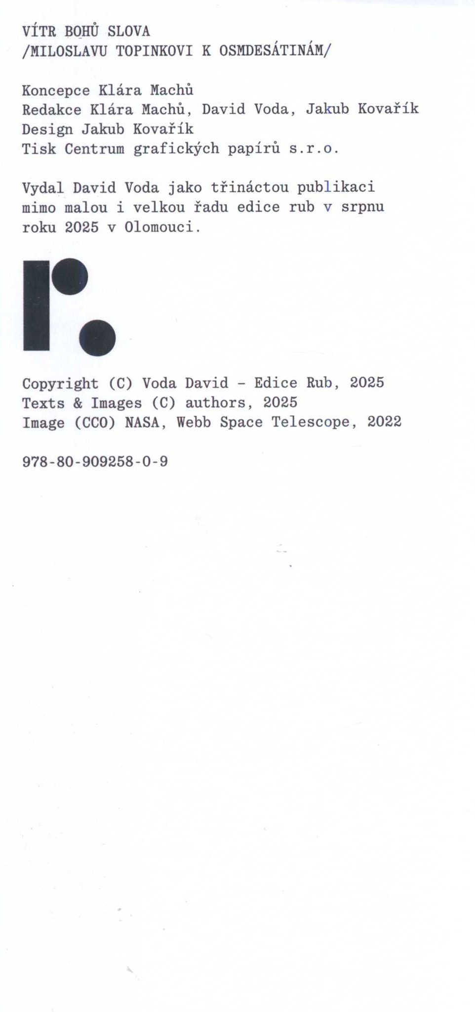 Title information Vítr bohů slova : (Miloslavu Topinkovi k osmdesátinám) / design Jakub Kovařík Další autoři Kovařík, Jakub, 1981- (Book designer) Voda, David, 1976- (Publisher) Corporation Centrum grafických papírů Olomouc (tiskařské a knihařské studio) (Printer) Publication V Olomouci : David Voda, 2025 Manufacture Centrum grafických papírů s.r.o. Scope 67 stran : ilustrace (některé barevné), noty ; 19 cm ISBN 978-80-909258-0-9 (vázáno) Edition Rub ; 13