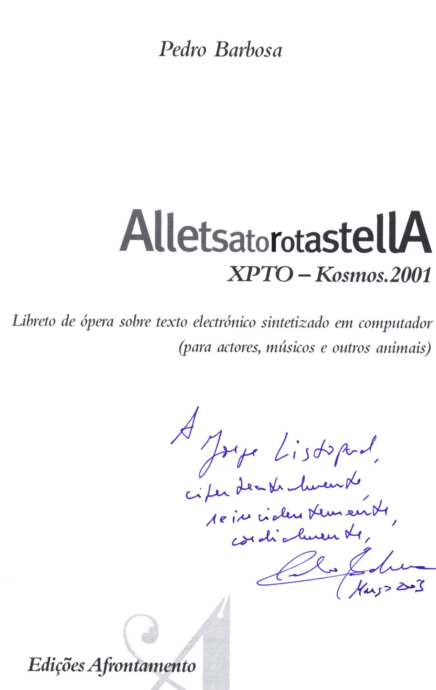 Title information Alletsatorotastella : XPTO – Kosmos.2001 / Personal name Barbosa, Pedro, 1950- (Author) Další autoři Edicões Afrontamento (Publisher) Rainho & Neves, Lda. (Printer) Publication [Porto] : Edicões Afrontamento, [2003] Manufacture Santa Maria da Feira : Rainho & Neves, Lda. Copyright notice date ©2003 Scope 57 stran ; 21 cm ISBN 972-36-0647-X (brožováno) Country Portugal Language Portuguese Note Zdobená obálka. - Informace o autorovi