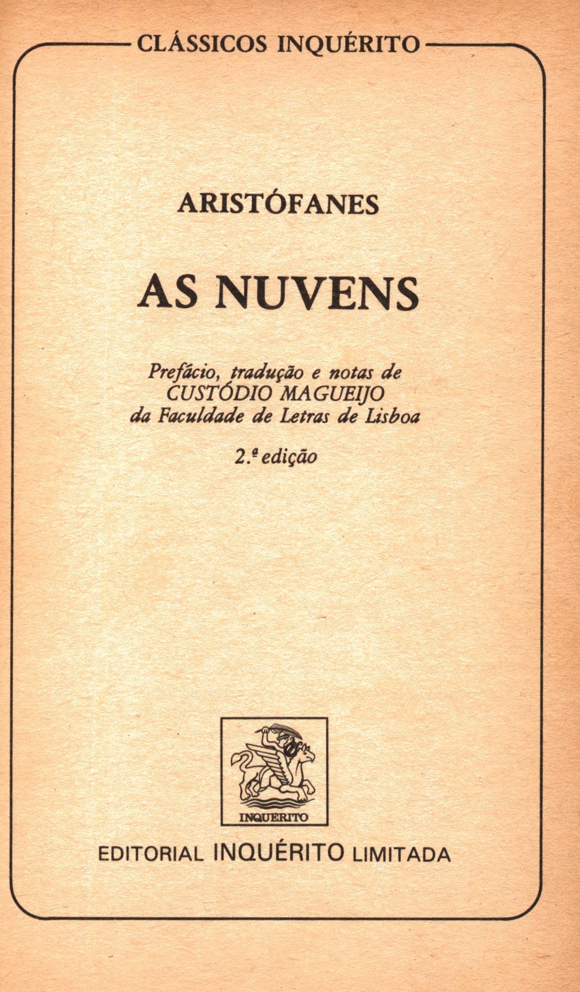 1. Title informationAs nuvens / Aristófanes ; prefácio, tradução e notas de Custódio Magueijo da Faculdade de Letras de Lisboa ; capa: estúdios P. E. A. ; editor: Francisco Lyon de Castro