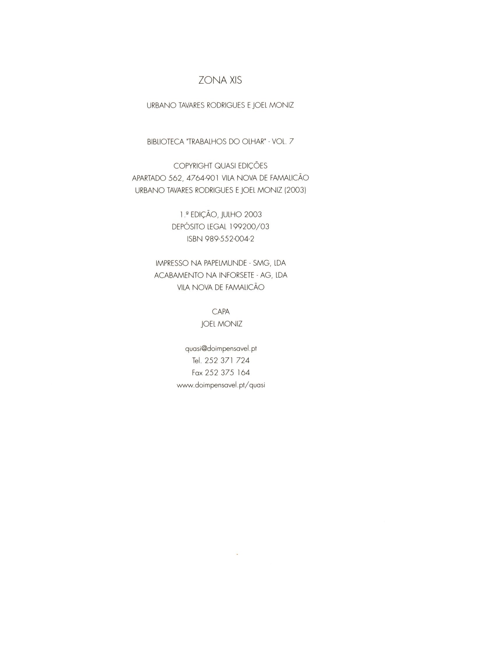 Title information Zona xis / Urbano Tavares Rodrigues ; Joel Moniz Personal name Rodrigues, Urbano Tavares, 1923-2013 (Author) Další autoři Moniz, Joel (Author) Corporation Quasi (Publisher) Papelmunde – SMG, LDA (Printer) Edition statement 1.a edição Publication [Vila Nova de Famalicão] : Quasi, [2003] Manufacture Papelmunde – SMG, LDA Scope 72 stran : čb. ilustrace ; 21 cm ISBN 989-552-004-2 (brožováno) Edition Trabalhos do olhar (Quasi) ; vol. 7